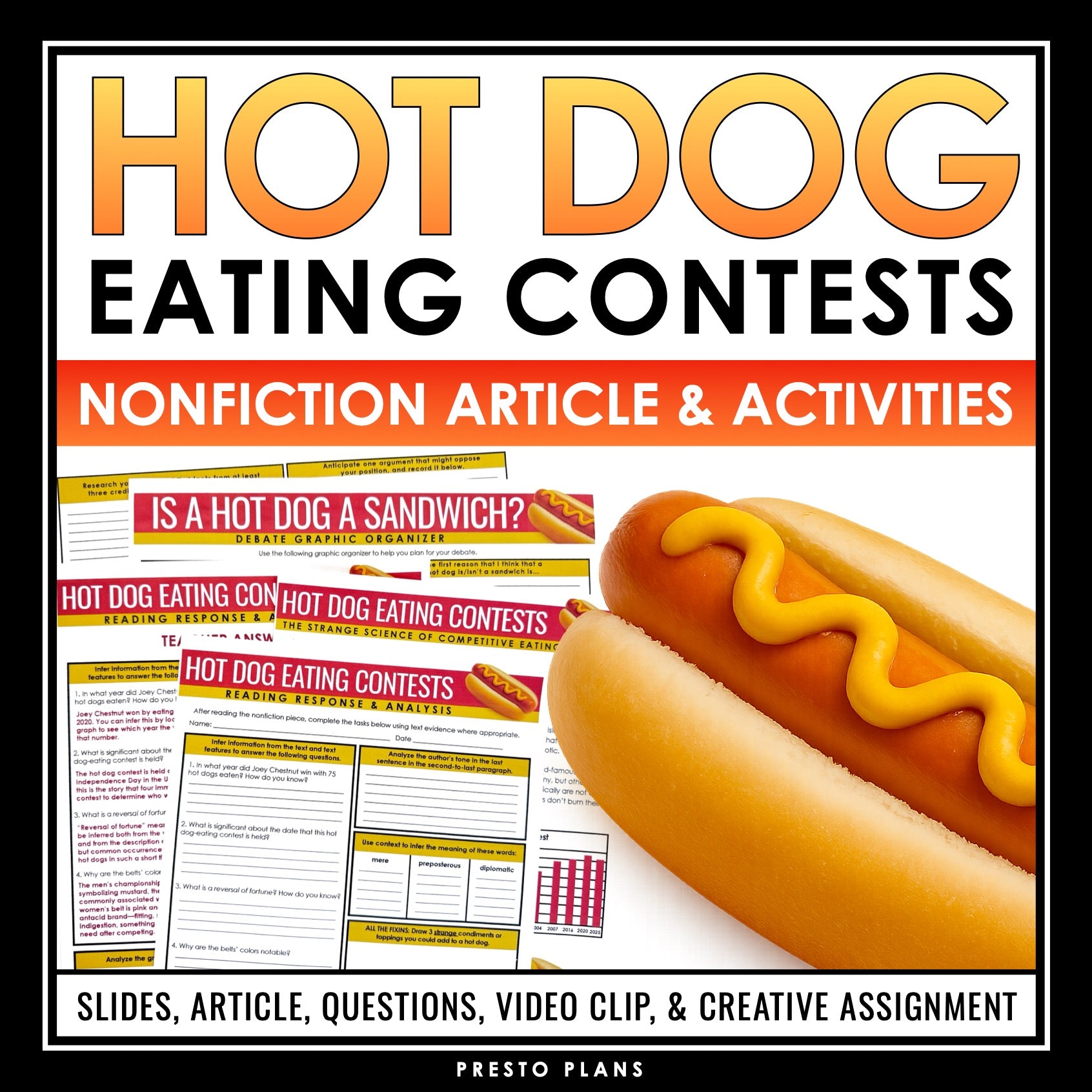 Nonfiction Reading Comprehension Article and Activities - Hot Dog Competitions: Bring nonfiction into your classroom with this comprehensive resource, designed to meet your informational text standards. Use the included presentation slides to guide this high-interest nonfiction reading comprehension lesson where students will read an article about hot dog eating contests. Students will then show their comprehension and analysis of the article with a ready-to-use response assignment, focusing on finding text evidence, making inferences, examining author’s tone, using context to determine the meaning of new vocabulary, analyze text features, and use creative thinking. Also included is a fun and creative assignment where students must debate the topic of whether or not a hot dog should be considered a sandwich. This nonfiction reading comprehension lesson has everything you need to help your students be stronger at reading and analyzing informational texts.