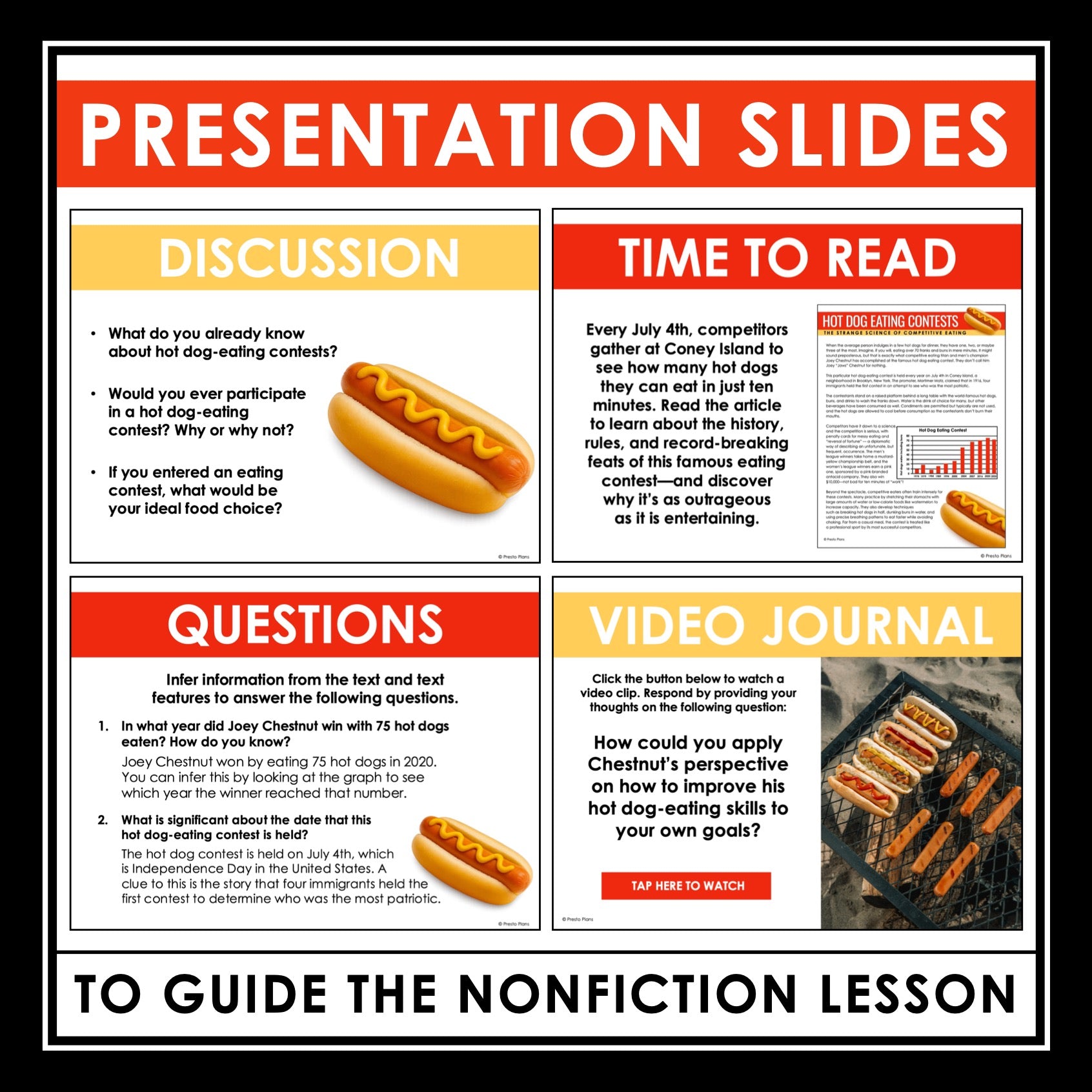 ➡️ Hot Dog Competitions Presentation Slides: Use this PowerPoint presentation to guide you through every element of the lesson. From pre-reading discussion questions to activity prompts and answer keys, each slide is crafted to facilitate engaging classroom discussions. Additionally, the presentation includes a link to a related video and a video writing prompt, enabling students to make meaningful text-to-self connections.