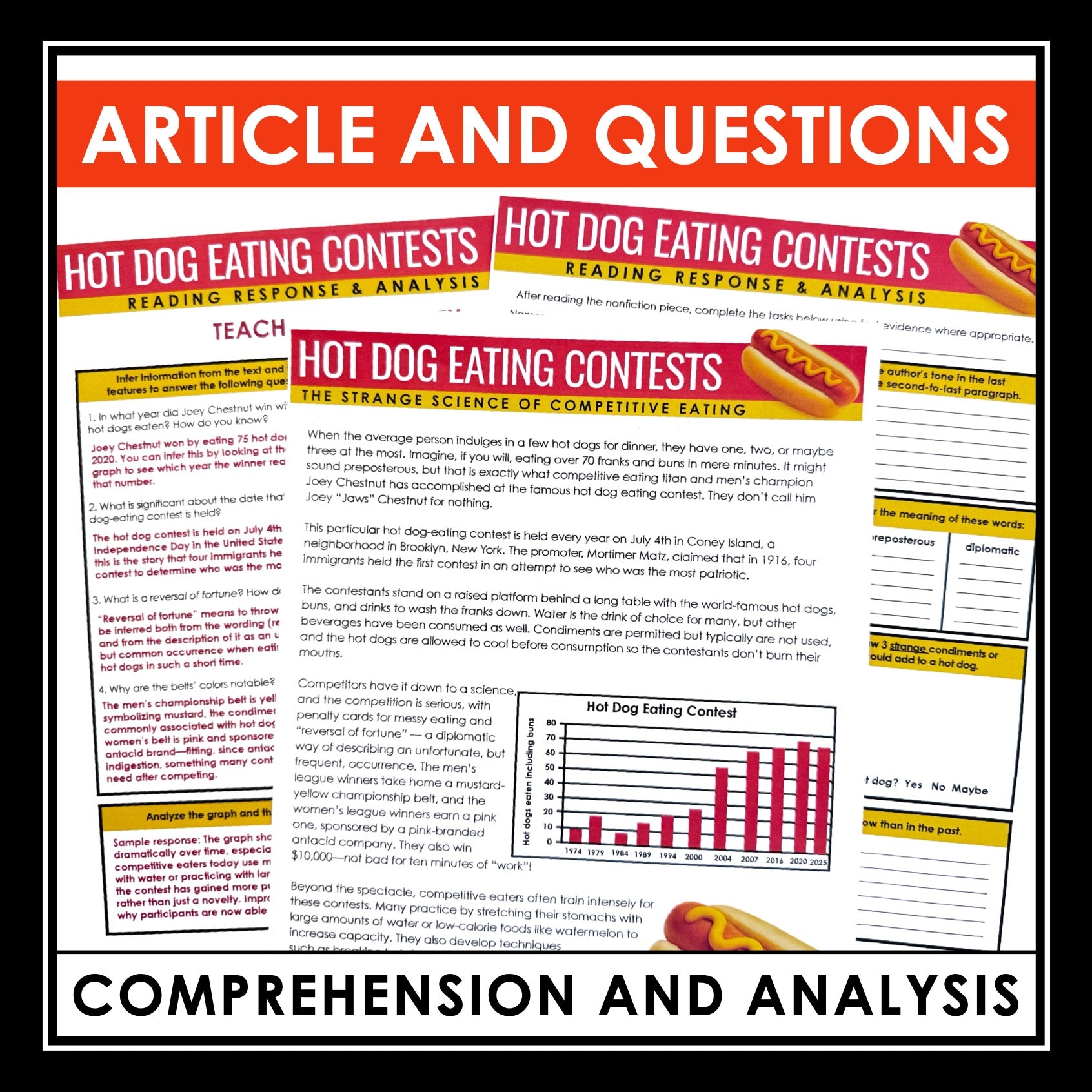 Nonfiction Reading Comprehension Article and Activities - Hot Dog Competitions