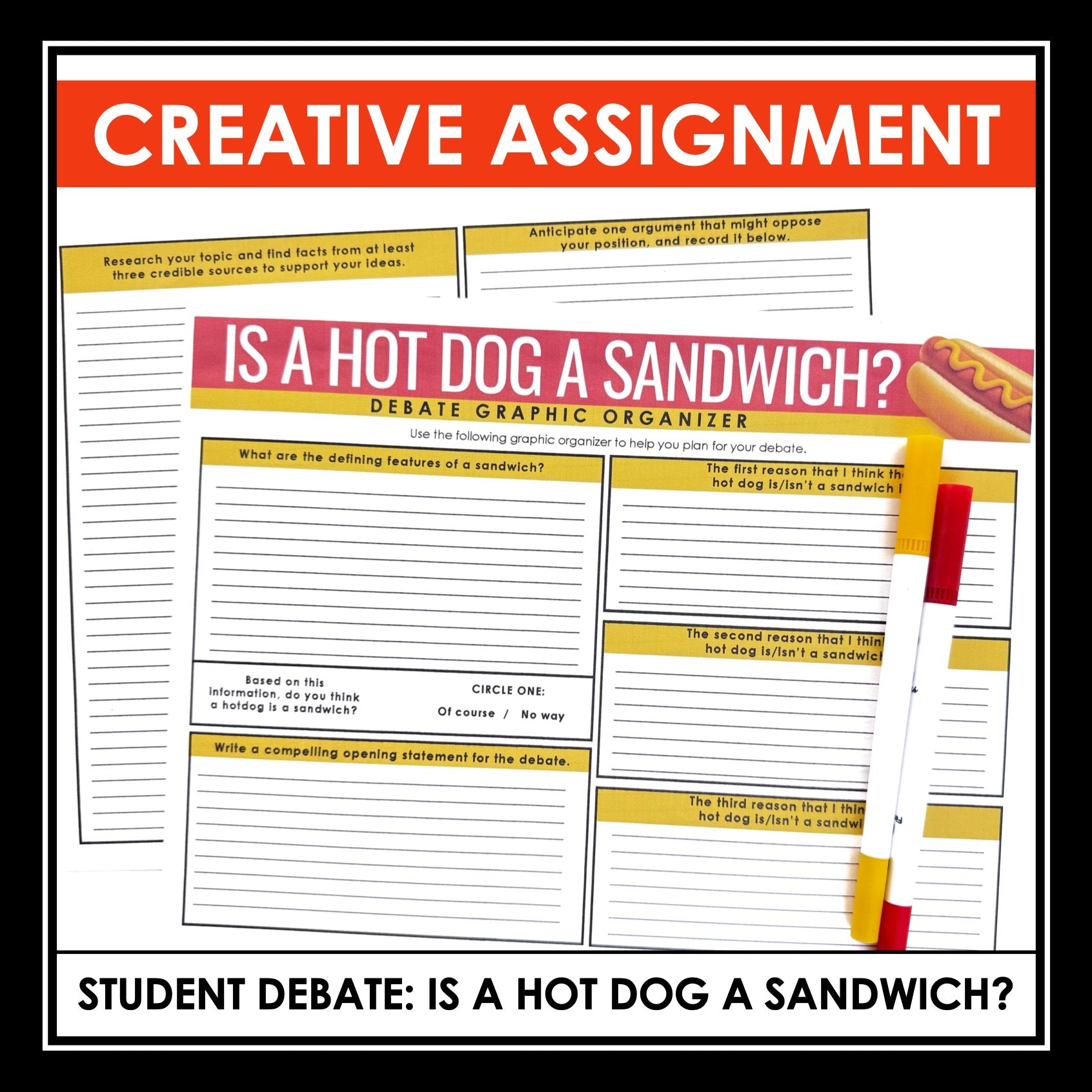 ➡️ Is a Hot Dog a Sandwich? Debate Creative Response Assignment: Foster creativity and critical thinking skills with this engaging assignment where students must debate the topic of whether or not a hot dog should be considered a sandwich. Included is a two-page graphic organizer that students can use to plan for the debate with a variety of prompting questions.