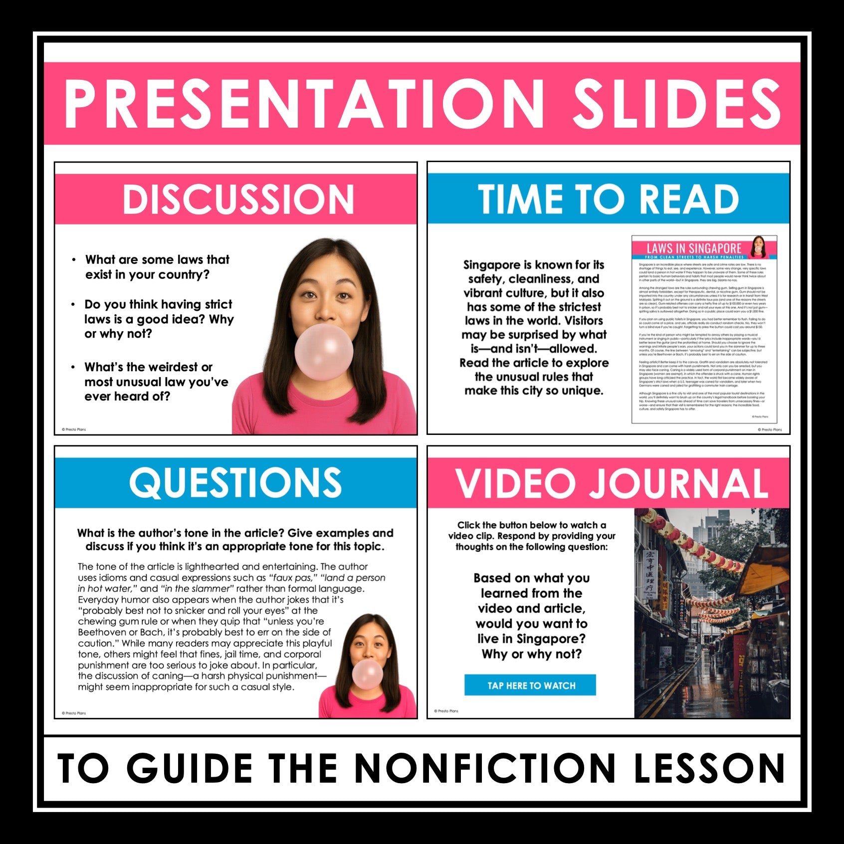 Nonfiction Reading Comprehension Article and Activities - Singapore Laws: Bring nonfiction into your classroom with this comprehensive resource, designed to meet your informational text standards. Use the included presentation slides to guide this high-interest nonfiction reading comprehension lesson where students will read an article about the unique laws of Singapore. Students will then show their comprehension and analysis of the article with a ready-to-use response assignment, focusing on finding text evidence, evaluating author’s tone, using context to infer the meaning of idioms, analyzing cause and effect, analyzing figurative language, and making and supporting claims. Also included is a fun and creative assignment where students must create a Singapore police report for their kidnapped principal. This nonfiction reading comprehension lesson has everything you need to help your students be stronger at reading and analyzing informational texts.
