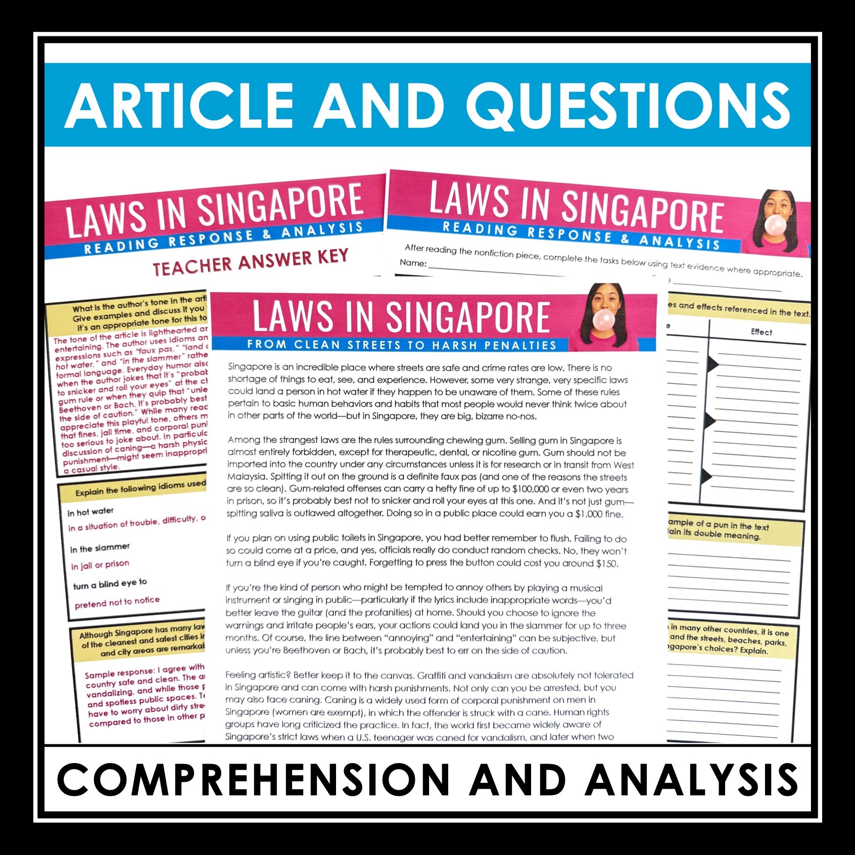 Included in This Laws Of Singapore Nonfiction Reading Comprehension Article and Activities Resource: