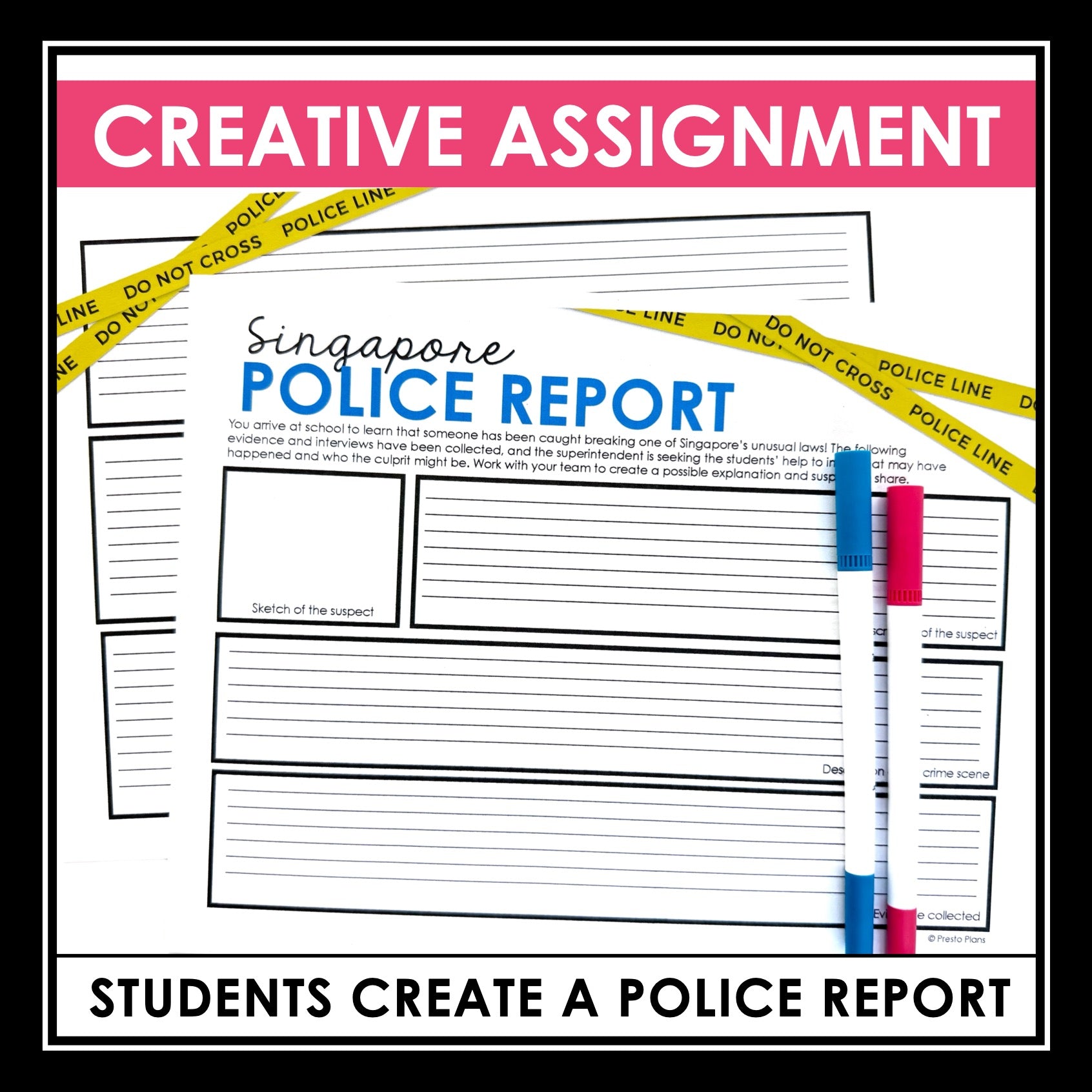 ➡️ Singapore Police Report Creative Response Assignment: Foster creativity and critical thinking skills with this engaging assignment where students must create a Singapore police report for their kidnapped principal. They will draw a sketch of their principal and write a description of their physical appearance, the crime scene, evidence, witness testimony, interrogation, and findings.