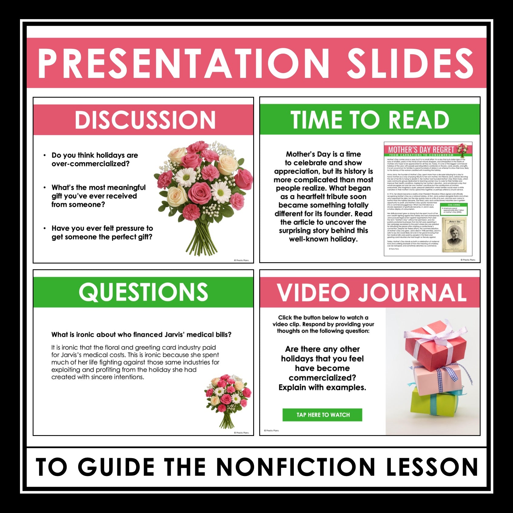 ➡️ Mother's Day History Presentation Slides: Use this PowerPoint presentation to guide you through every element of the lesson. From pre-reading discussion questions to activity prompts and answer keys, each slide is crafted to facilitate engaging classroom discussions. Additionally, the presentation includes a link to a related video and a video writing prompt, enabling students to make meaningful text-to-self connections.
