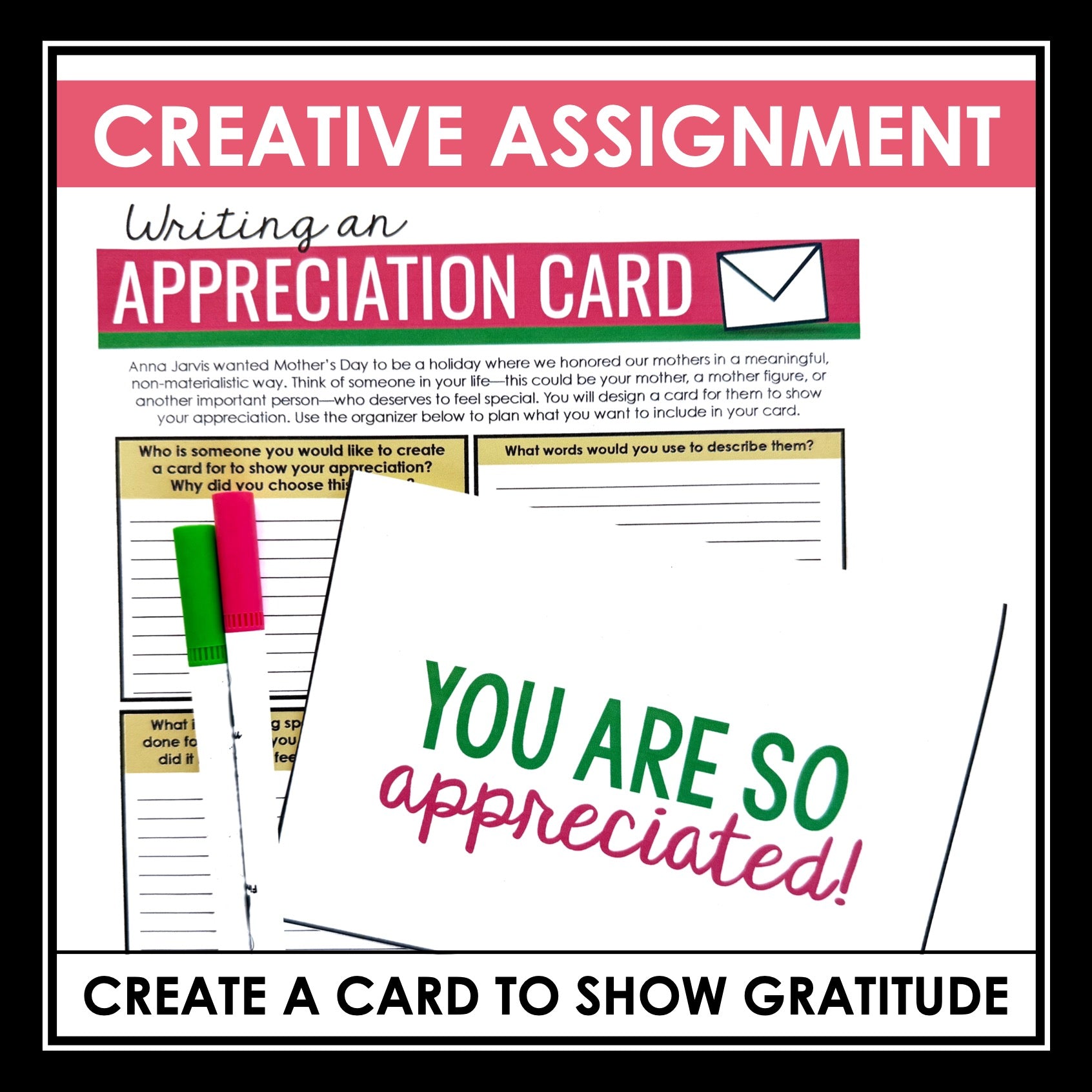 ➡️ Showing Your Appreciation Card Making Creative Response Assignment: Foster creativity and critical thinking skills with this engaging assignment where students must design and write a card for someone they appreciate (it could be a mother, mother figure, or anyone important to them). They will plan out what they want to say in their card using the organizer and design the find card on the good copy template.