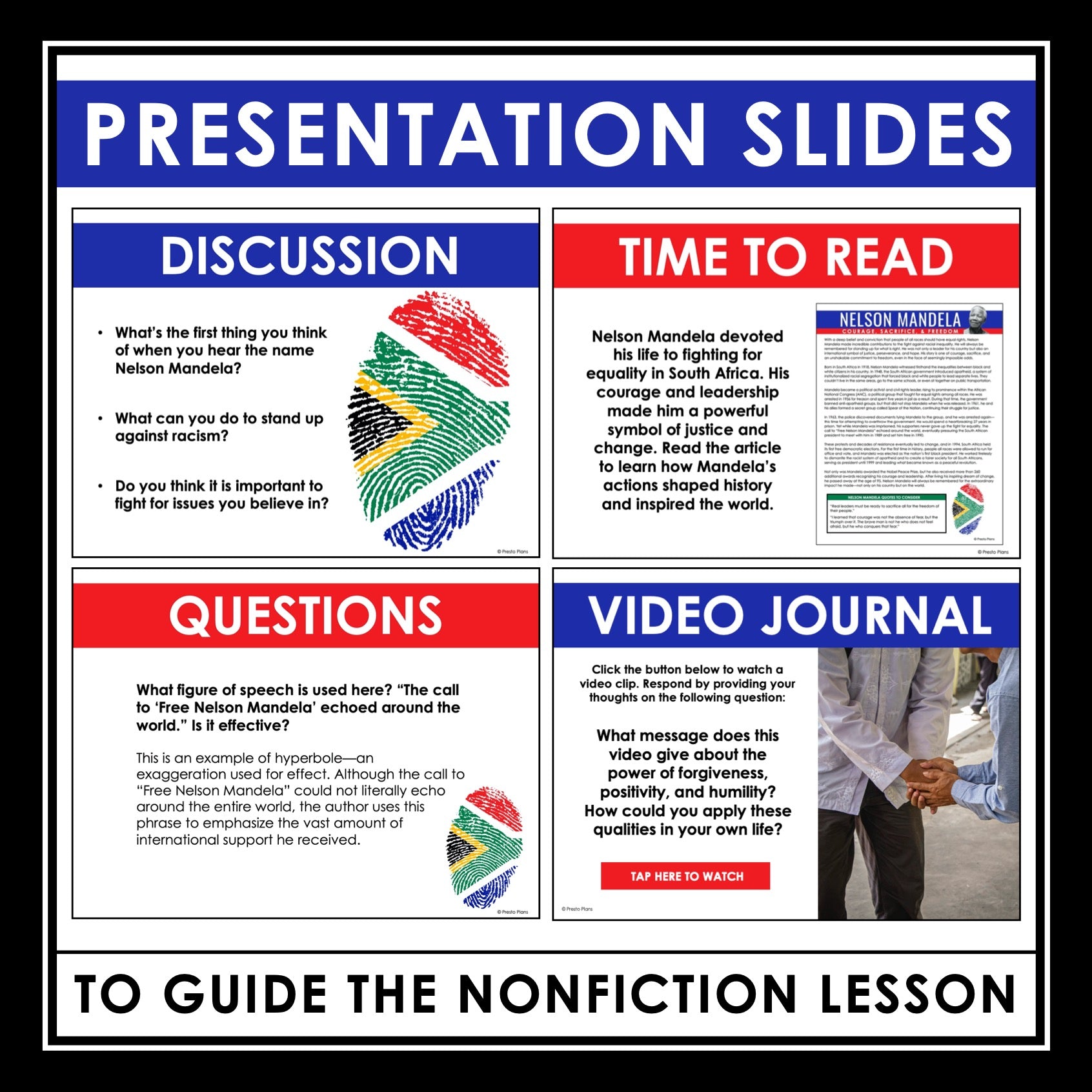 ➡️ Nelson Mandela Presentation Slides: Use this PowerPoint presentation to guide you through every element of the lesson. From pre-reading discussion questions to activity prompts and answer keys, each slide is crafted to facilitate engaging classroom discussions. Additionally, the presentation includes a link to a related video and a video writing prompt, enabling students to make meaningful text-to-self connections.