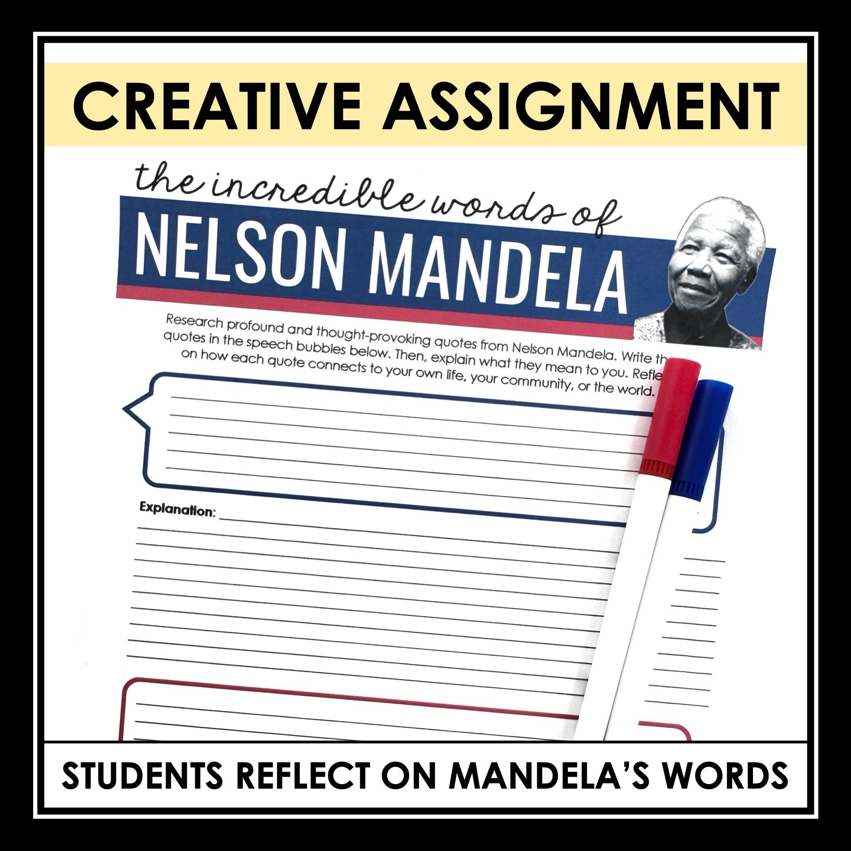 ➡️ The Incredible Words of Nelson Mandela Creative Response Assignment: Foster creativity and critical thinking skills with this engaging assignment. Students must find and examine quotes from Nelson Mandela that they think are profound or thought-provoking. Students will share the quotes they chose and explain what they mean to them. How can they relate the quote to their life, their community, or the world in general?
