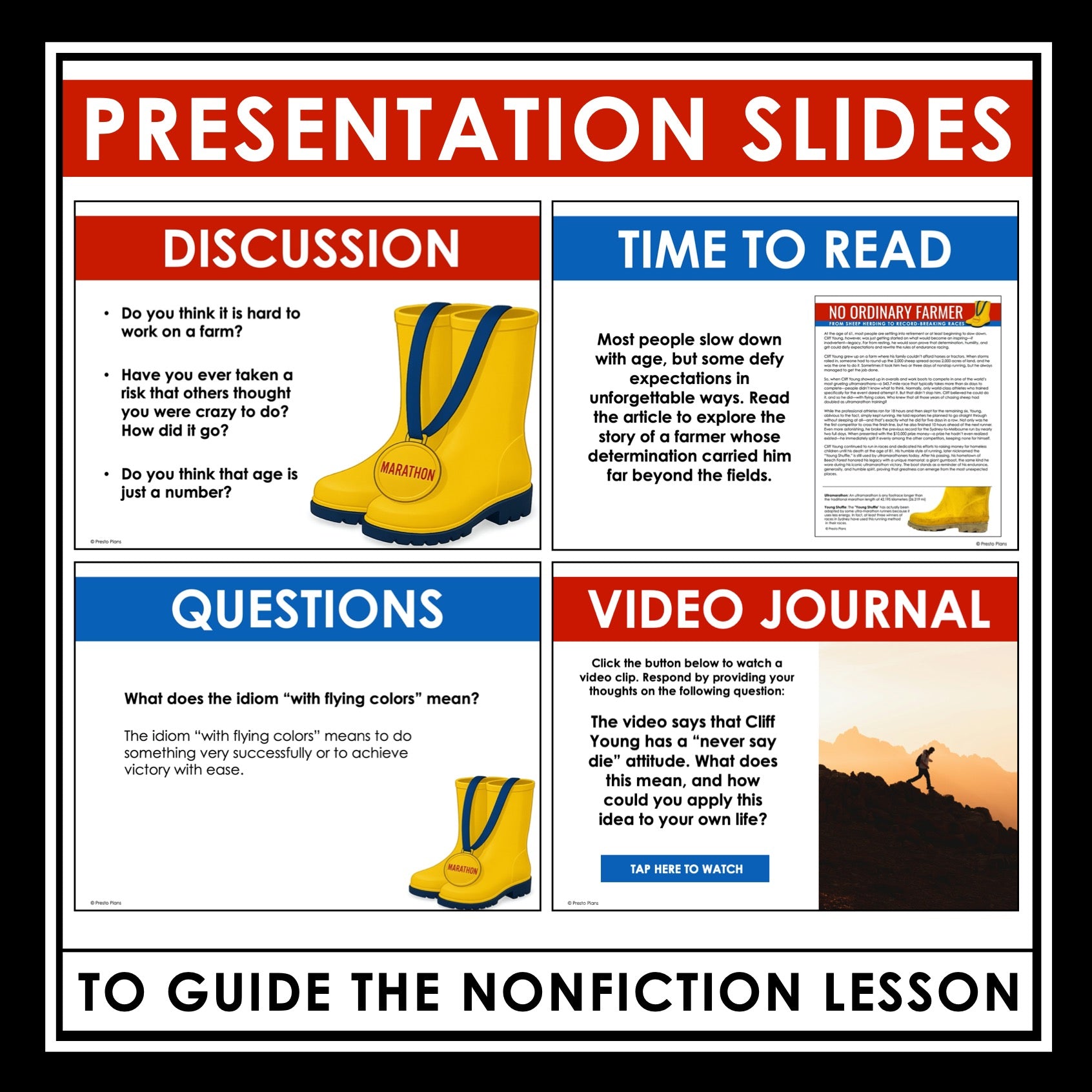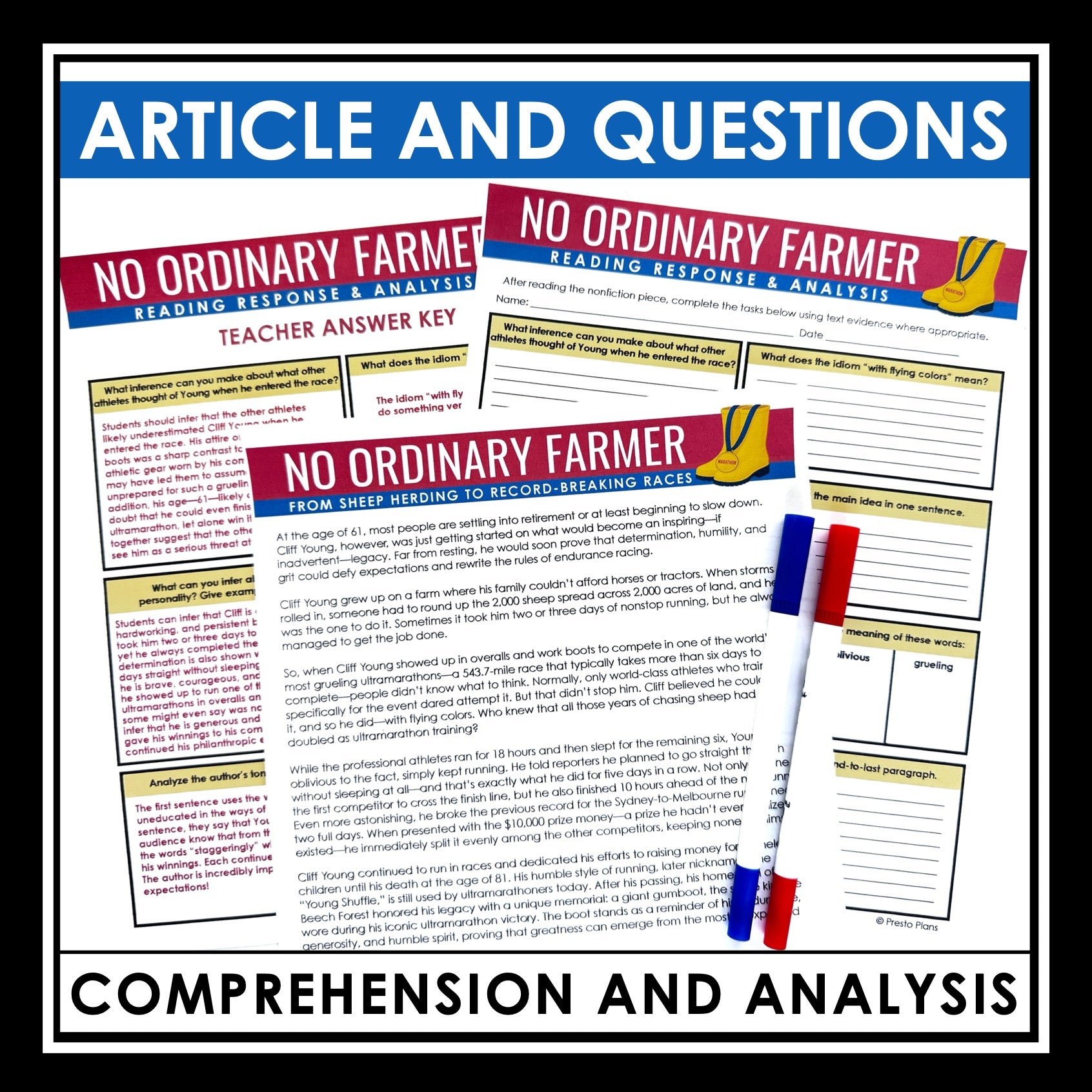 Nonfiction Reading Comprehension Article and Activities - Cliff Young Farmer: Bring nonfiction into your classroom with this comprehensive resource, designed to meet your informational text standards. Use the included presentation slides to guide this high-interest nonfiction reading comprehension lesson where students will read an article about Cliff Young, an Australian potato farmer who gained fame for winning the inaugural Sydney to Melbourne Ultramarathon in 1983 at the age of 61, with no preparation using an unconventional shuffling running style. Students will then show their comprehension and analysis of the article with a ready-to-use response assignment, focusing on making inferences, analyzing author’s tone, evaluating word choice, understanding idioms, summarizing the main idea, and using context to determine vocabulary meaning. Also included is a fun and creative interview assignment where students imagine they have the opportunity to interview Cliff Young. This nonfiction reading comprehension lesson has everything you need to help your students be stronger at reading and analyzing informational texts.