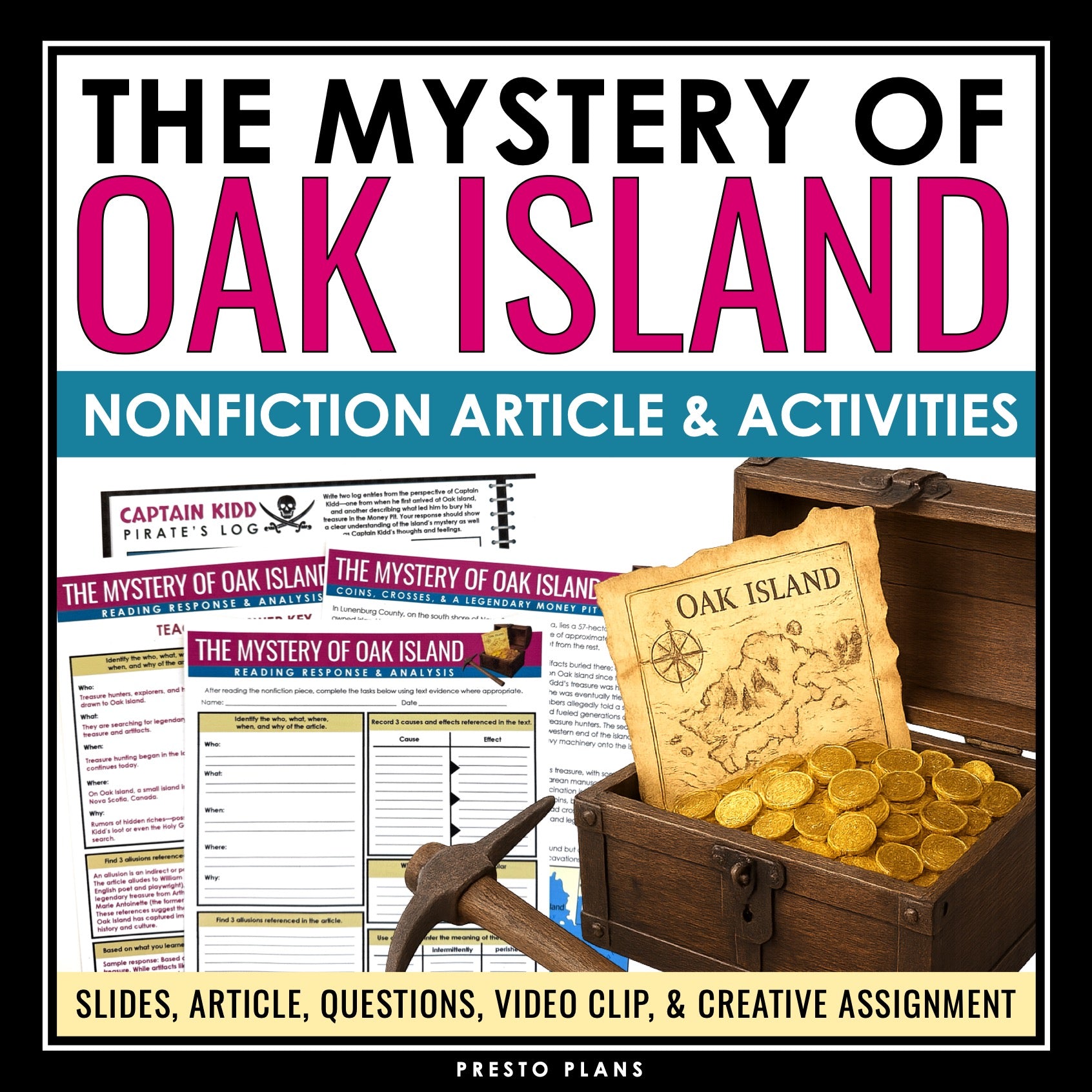 Oak Island Mystery Nonfiction Reading Comprehension Article and Activities: Bring nonfiction into your classroom with this comprehensive resource, designed to meet your informational text standards. Use the included presentation slides to guide this high-interest nonfiction reading comprehension lesson where students will read an article about the mystery of Oak Island. Students will then show their comprehension and analysis of the article with a ready-to-use response assignment, focusing on finding text evidence, examining figurative language, analyzing cause and effect, making inferences, using context to determine the meaning of new vocabulary, and making judgements. Also included is a fun and creative assignment where students must write two pirate’s log entries from the perspective of Captain Kidd from when he arrived at Oak Island. This nonfiction reading comprehension lesson has everything you need to help your students be stronger at reading and analyzing informational texts.