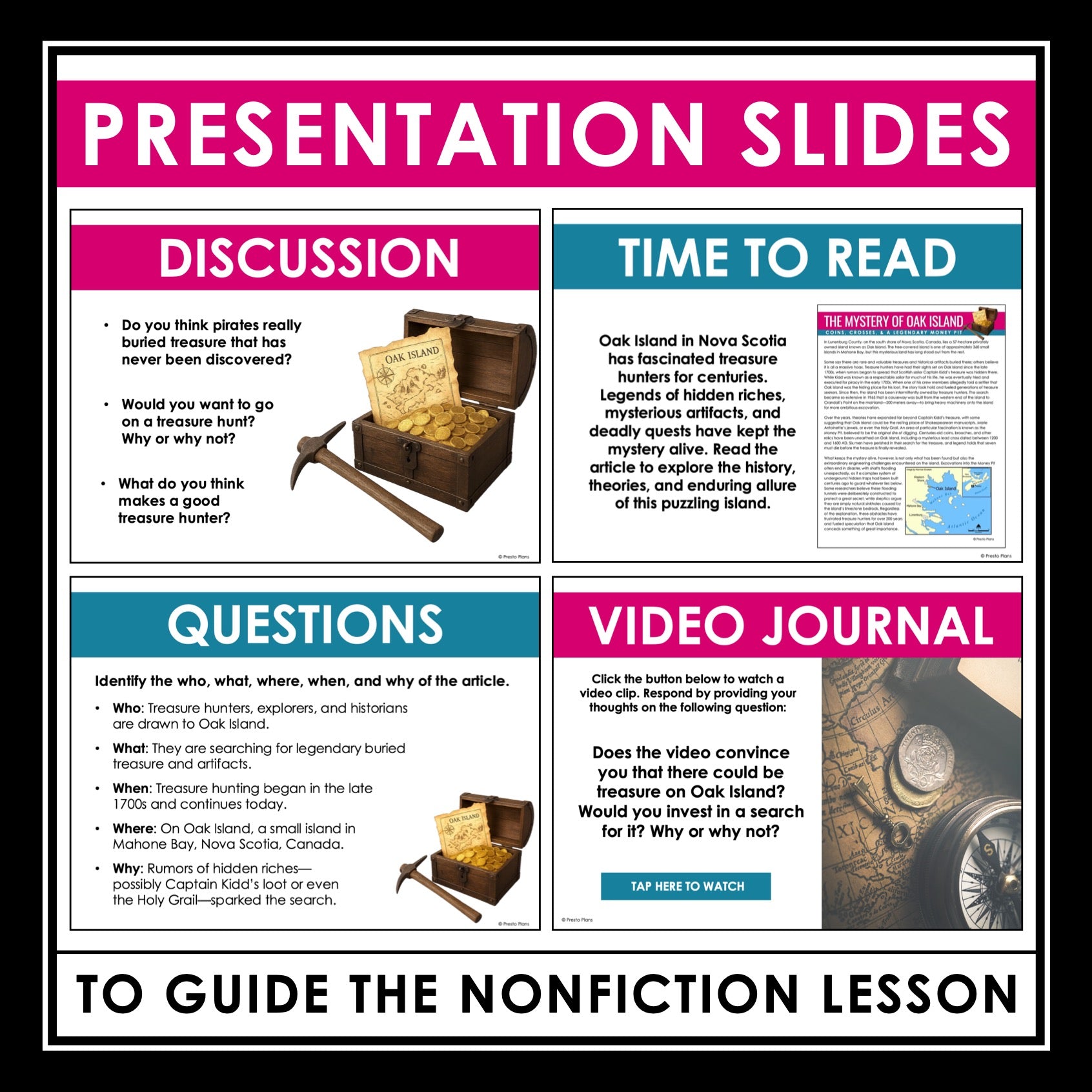 ➡️ Oak Island Mystery Presentation Slides: Use this PowerPoint presentation to guide you through every element of the lesson. From pre-reading discussion questions to activity prompts and answer keys, each slide is crafted to facilitate engaging classroom discussions. Additionally, the presentation includes a link to a related video and a video writing prompt, enabling students to make meaningful text-to-self connections.
