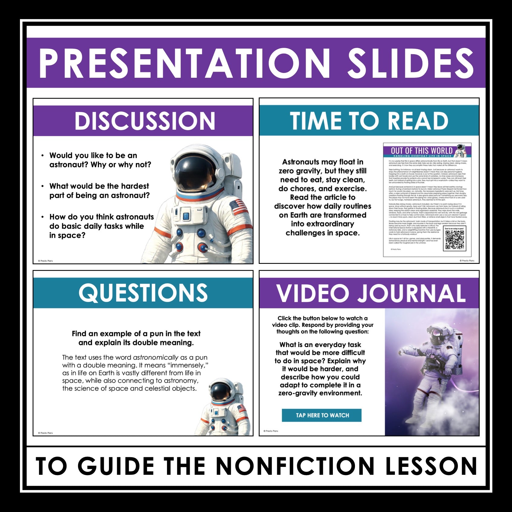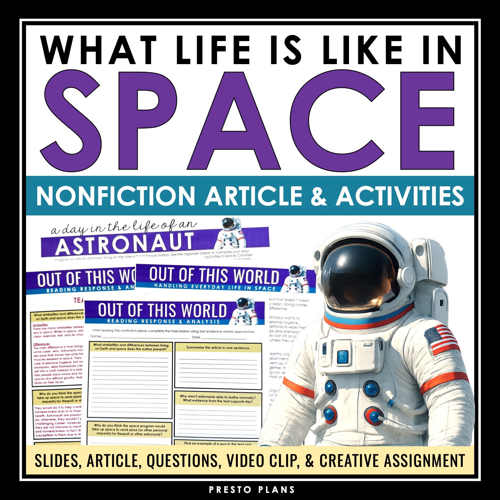 Nonfiction Reading Comprehension Article and Activities - Life in Space: Bring nonfiction into your classroom with this comprehensive resource, designed to meet your informational text standards. Use the included presentation slides to guide this high-interest nonfiction reading comprehension lesson where students will read an article about what life is like for astronauts in space. Students will then show their comprehension and analysis of the article with a ready-to-use response assignment, focusing on finding text evidence, comparing and contrasting information, making inferences, summarizing information, analyzing figurative language, and making connections. Also included is a fun and creative assignment where students must write a daily schedule as an astronaut living in space. This nonfiction reading comprehension lesson has everything you need to help your students be stronger at reading and analyzing informational texts.