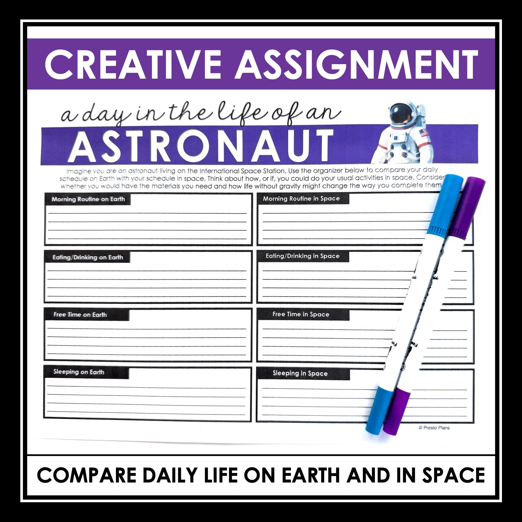 ➡️ A Day in the Life of an Astronaut Creative Response Assignment: Foster creativity and critical thinking skills with this engaging assignment where students must write a daily schedule as an astronaut living in space. They will imagine that they are astronauts living at the International Space Station. Students will use the organizer to compare their current daily schedule on Earth to their schedule in space by theorizing how they might do their regular tasks in space without gravity.