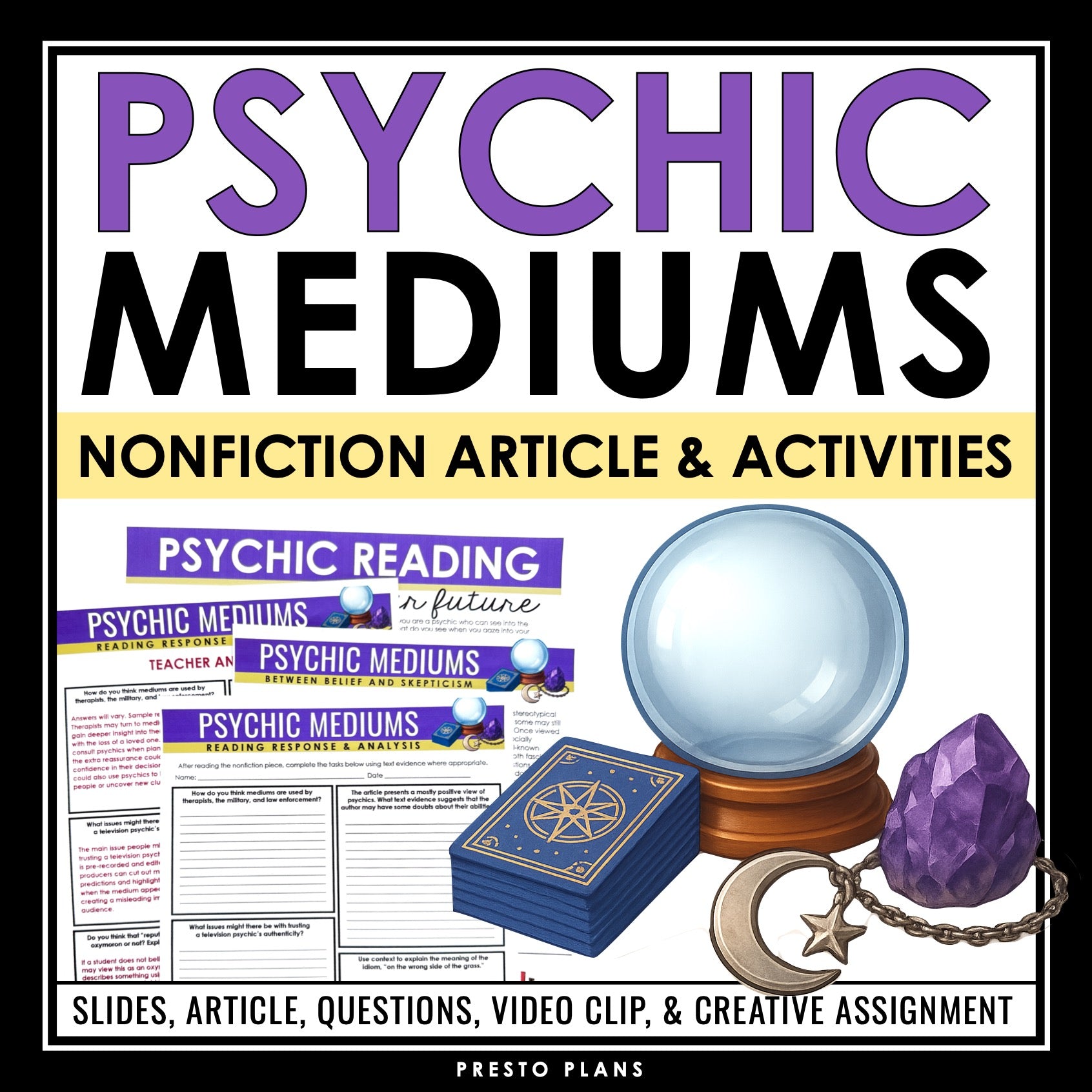 Nonfiction Reading Comprehension Article and Activities - Psychic Mediums: Bring nonfiction into your classroom with this comprehensive resource, designed to meet your informational text standards. Use the included presentation slides to guide this high-interest nonfiction reading comprehension lesson where students will read an article about psychic mediums. Students will then show their comprehension and analysis of the article with a ready-to-use response assignment, focusing on finding text evidence, making inferences, analyzing figurative language, author’s tone, and using context to determine the meaning of unknown idioms. Also included is a fun and creative assignment where students must imagine they are a psychic who can see their own future. This nonfiction reading comprehension lesson has everything you need to help your students be stronger at reading and analyzing informational texts.