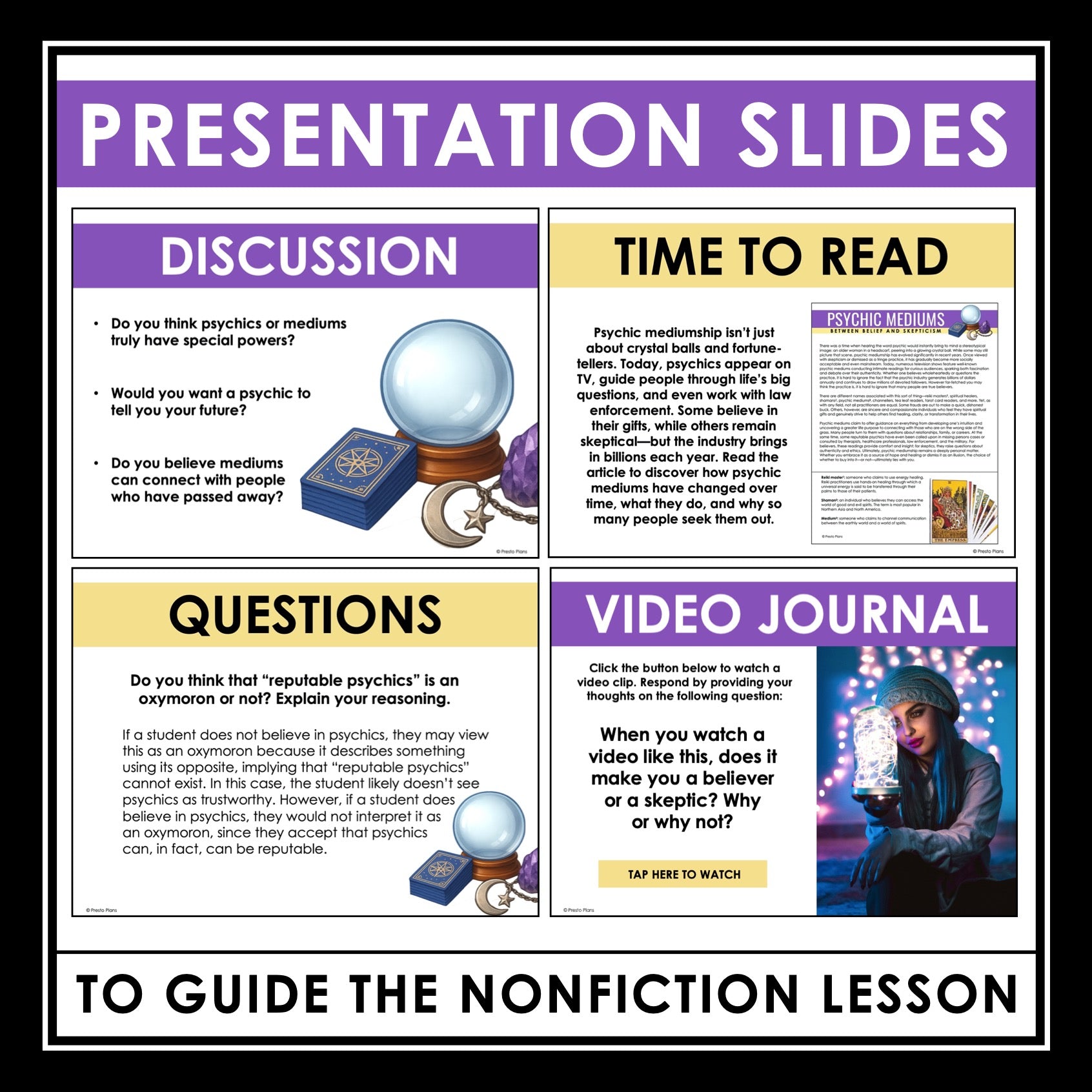 ➡️ Psychic Mediums Presentation Slides: Use this PowerPoint presentation to guide you through every element of the lesson. From pre-reading discussion questions to activity prompts and answer keys, each slide is crafted to facilitate engaging classroom discussions. Additionally, the presentation includes a link to a related video and a video writing prompt, enabling students to make meaningful text-to-self connections.