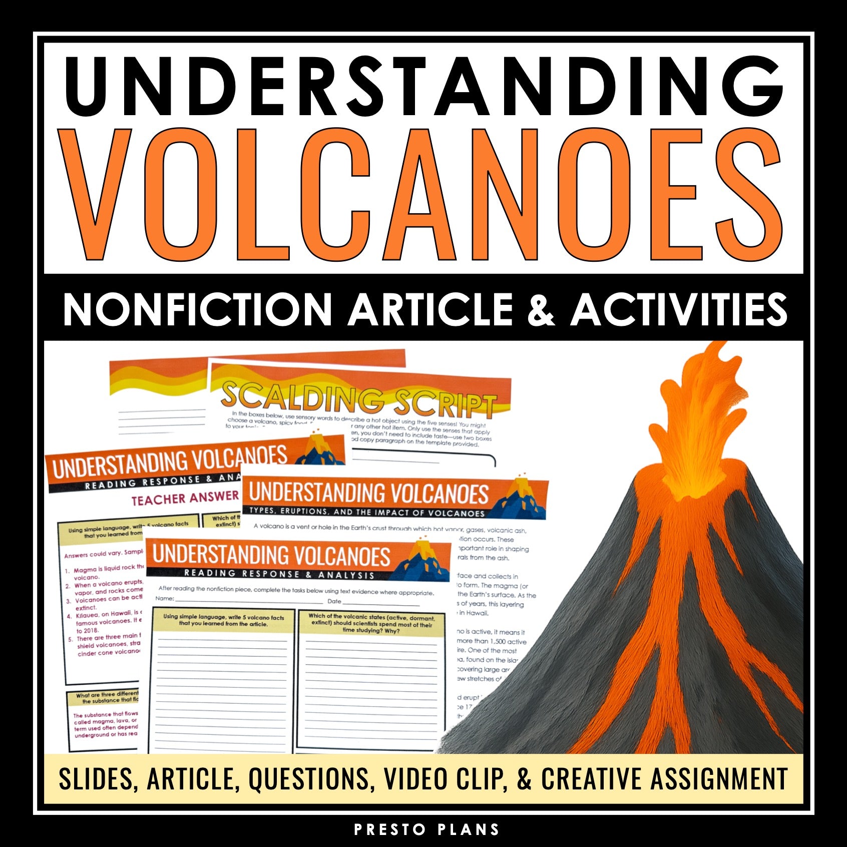 Nonfiction Reading Comprehension Article and Activities - Volcanoes: Bring nonfiction into your classroom with this comprehensive resource, designed to meet your informational text standards. Use the included presentation slides to guide this high-interest nonfiction reading comprehension lesson where students will read an article about how volcanoes function. Students will then show their comprehension and analysis of the article with a ready-to-use response assignment, focusing on summarizing, finding text evidence, evaluating information, synthesizing information, creative thinking, and more. Also included is a fun and creative scalding script assignment where students use sensory words to describe a hot object using the 5 senses! This nonfiction reading comprehension lesson has everything you need to help your students be stronger at reading and analyzing informational texts.