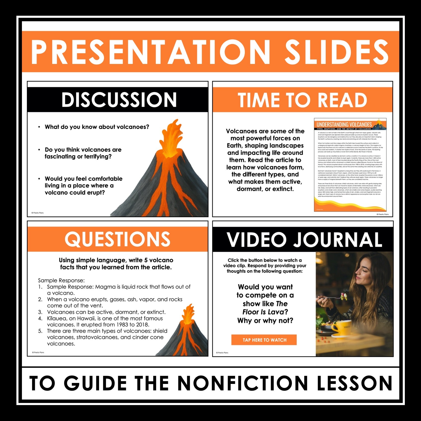 ➡️ Volcanoes Presentation Slides: Use this PowerPoint presentation to guide you through every element of the lesson. From pre-reading discussion questions to activity prompts and answer keys, each slide is crafted to facilitate engaging classroom discussions. Additionally, the presentation includes a link to a related video and a video writing prompt, enabling students to make meaningful text-to-self connections.