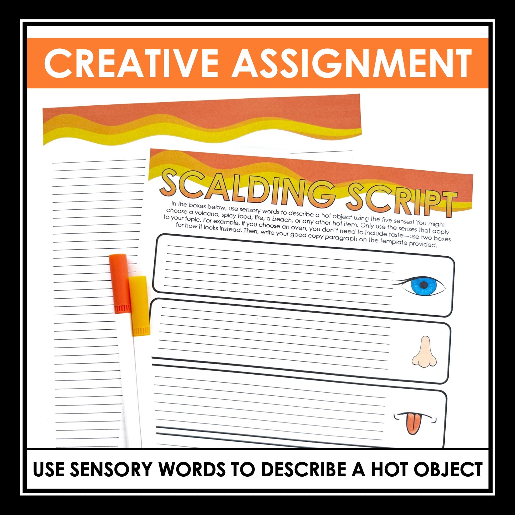 ➡️ Scalding Script Creative Response Assignment: Foster creativity and critical thinking skills with this engaging assignment. Students use sensory words to describe a hot object using the 5 senses! They might choose a volcano, fire, beach, or anything else that is hot! An imagery graphic organizer is provided as well as an eye-catching good copy template.