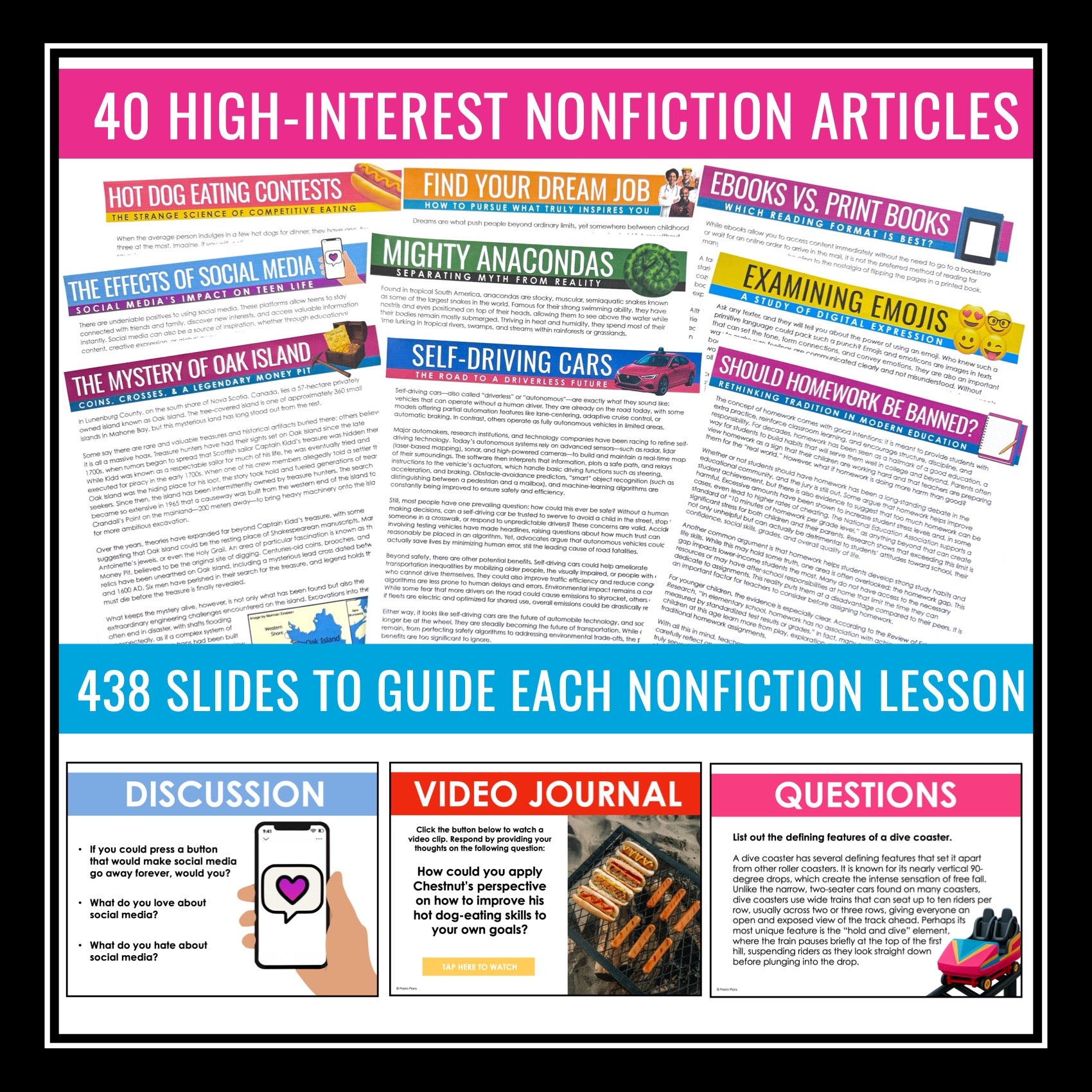 ➡️ 40 Nonfiction Articles on High-Interest Topics: The program includes a collection of carefully curated, original articles covering a wide array of subjects relevant to students' lives and interests. These high-interest texts cover nearly all informational text standards. Each article is written to captivate student interest while promoting critical thinking and analytical skills.