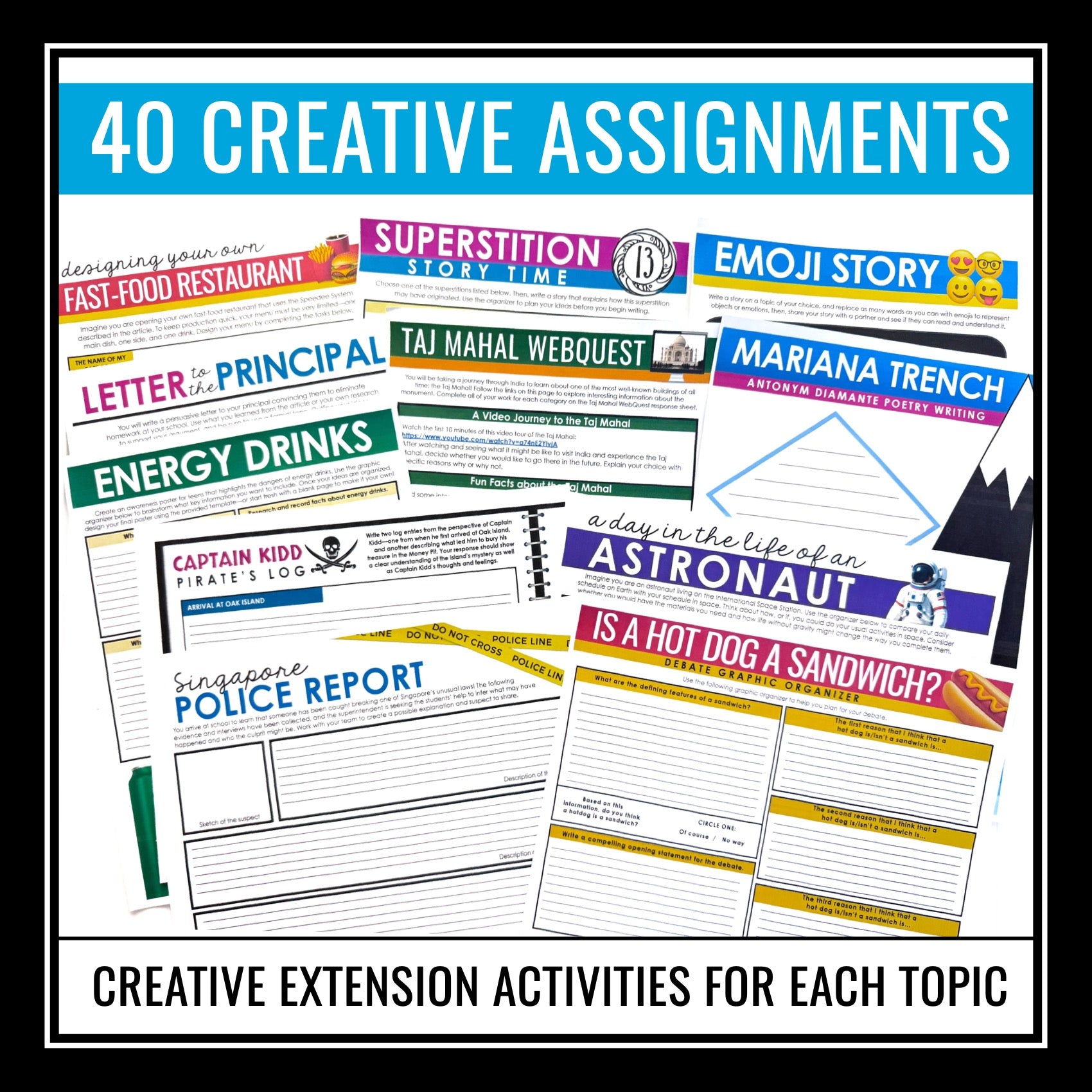 ➡️ 40 Creative Assignments: Each lesson concludes with a creative assignment that gives students an opportunity to explore the topic further through imaginative activities. These assignments enable students to reinforce their understanding of the article, apply their reading skills in innovative ways, and meet additional reading and writing standards.