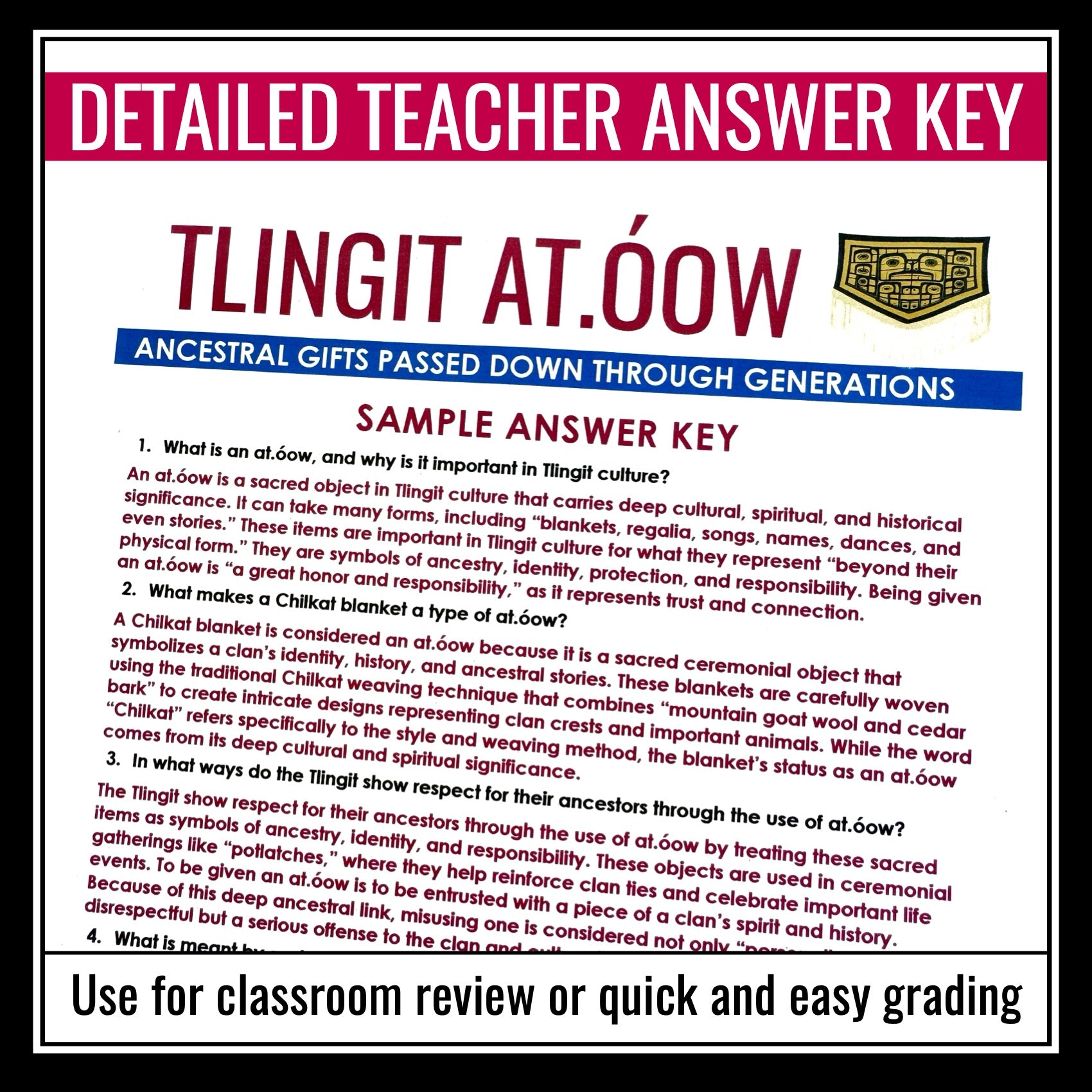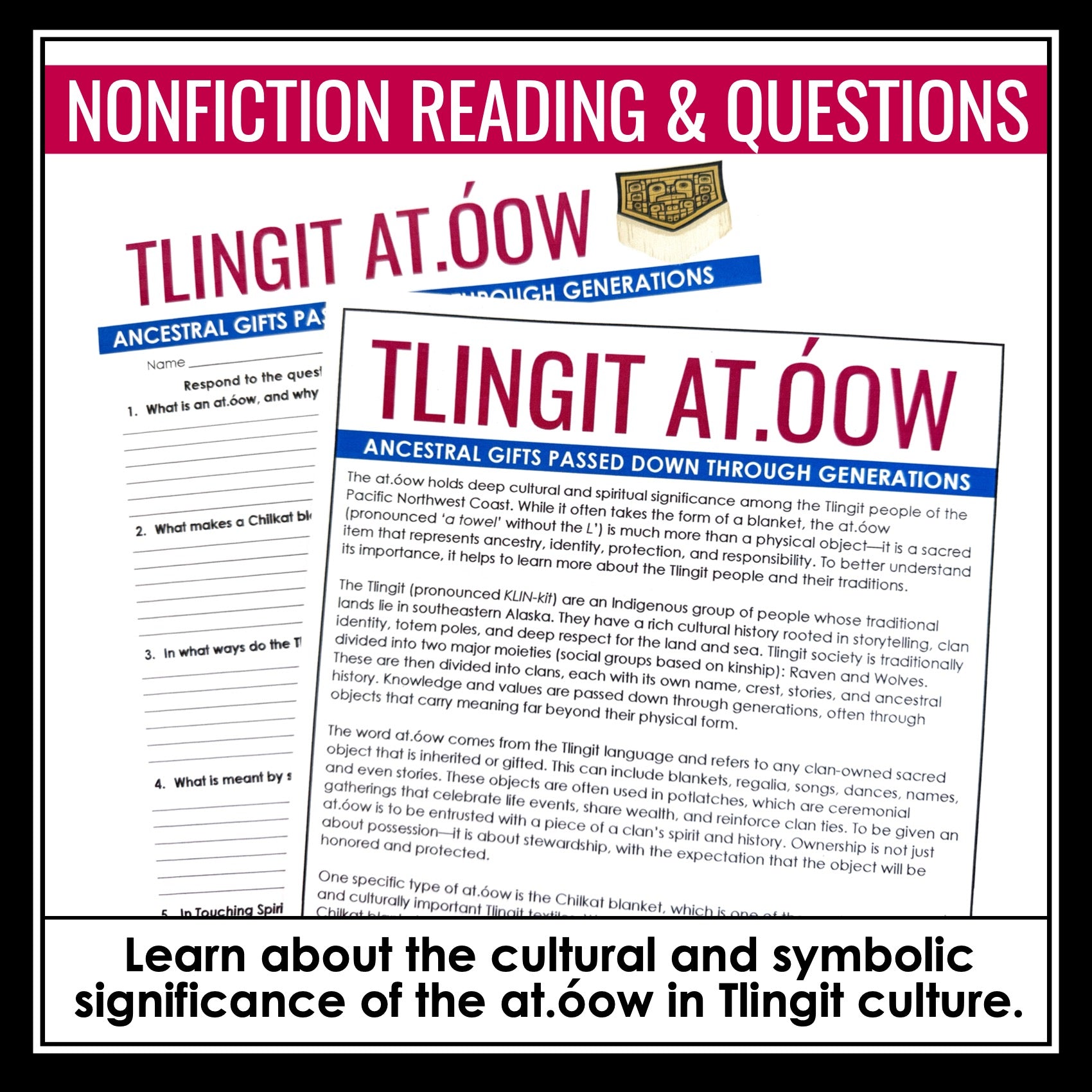 ➡️ At.óow Blanket Nonfiction Reading Article and Questions: Students will read an engaging article about the cultural and spiritual importance of the at.óow within Tlingit society. The reading covers its role as an ancestral gift, the symbolism behind the Chilkat blanket, and how it represents stewardship rather than ownership. Students will answer comprehension and reflection questions that connect directly to Garvey’s gift to Cole in the novel.