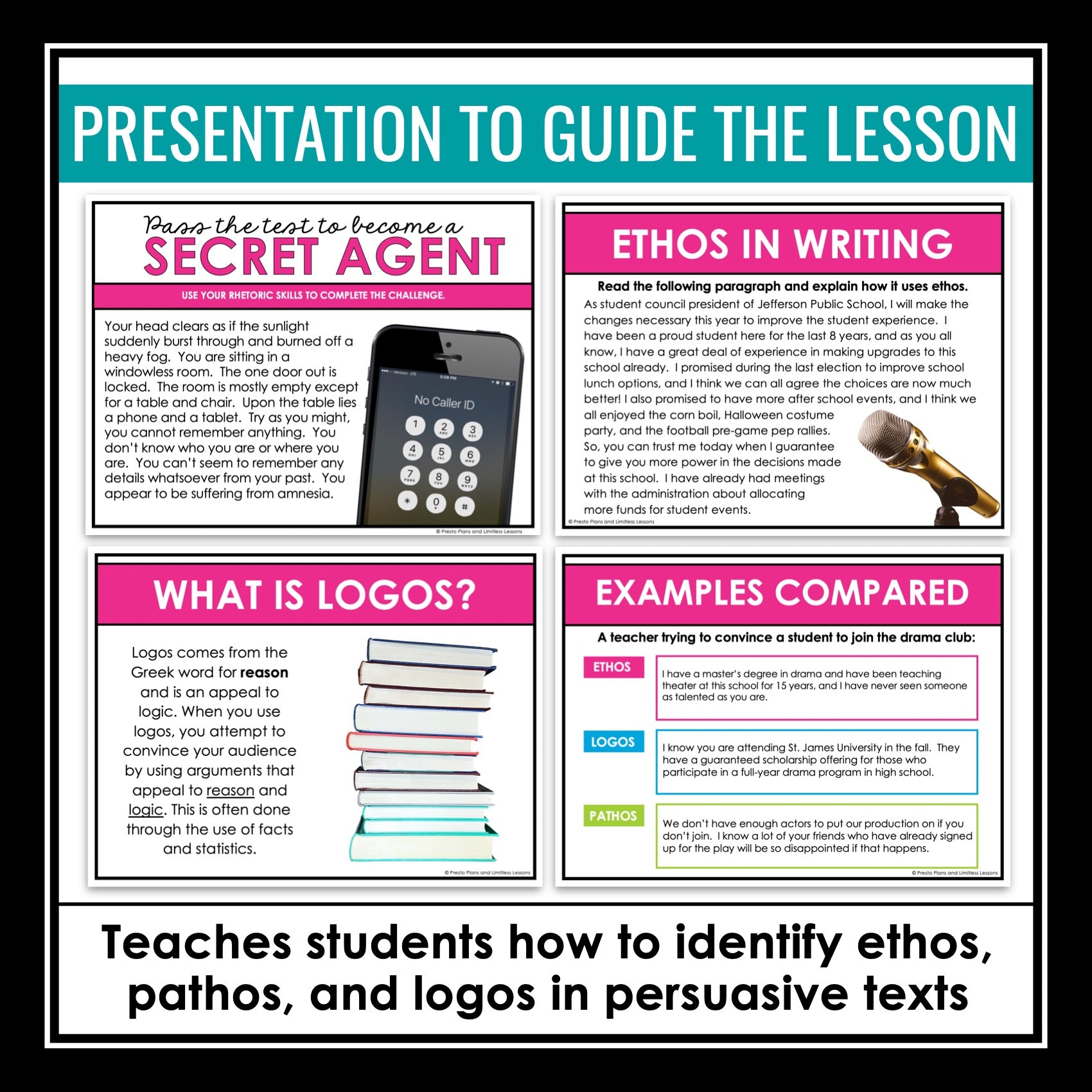 Ethos Pathos Logos Presentation Rhetorical Appeals Escape Room Reading Activity: This ethos, pathos, and logos reading escape room style challenge is a new and fun way to engage your students and improve their understanding of the three rhetorical appeals in persuasive writing! The detailed presentation introduces the 3 rhetorical appeals with clear examples, ensuring student understanding from the start. The highlight of the resource is the engaging escape room-style challenge, where students read an original narrative back story where they must pass a test to become a secret agent. Then, they must collaborate in groups to crack an ethos, pathos, and logos challenge to unlock the solution and find the password to become a secret agent!