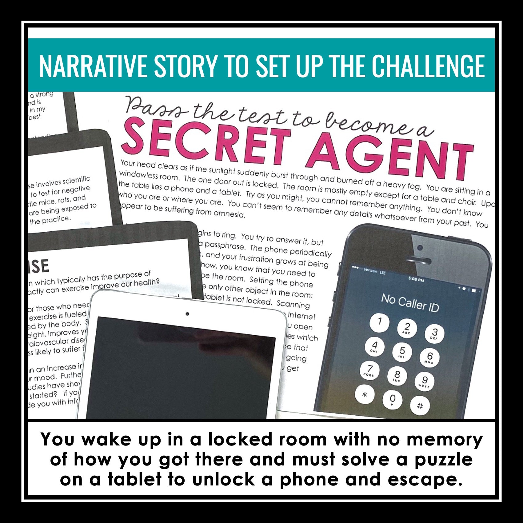 ➡️ Become a Secret Agent Narrative Back Story: Next, students are ready to put what they have learned into action! They will begin the challenge by reading a short backstory that sets up the escape room challenge. Students awaken in a windowless room, suffering from amnesia, with only a phone and a tablet present; unable to recall any details from their past, they must solve a puzzle within the Exit Strategy app on the tablet to unlock the phone, escape the room, and uncover the mystery surrounding their situation.