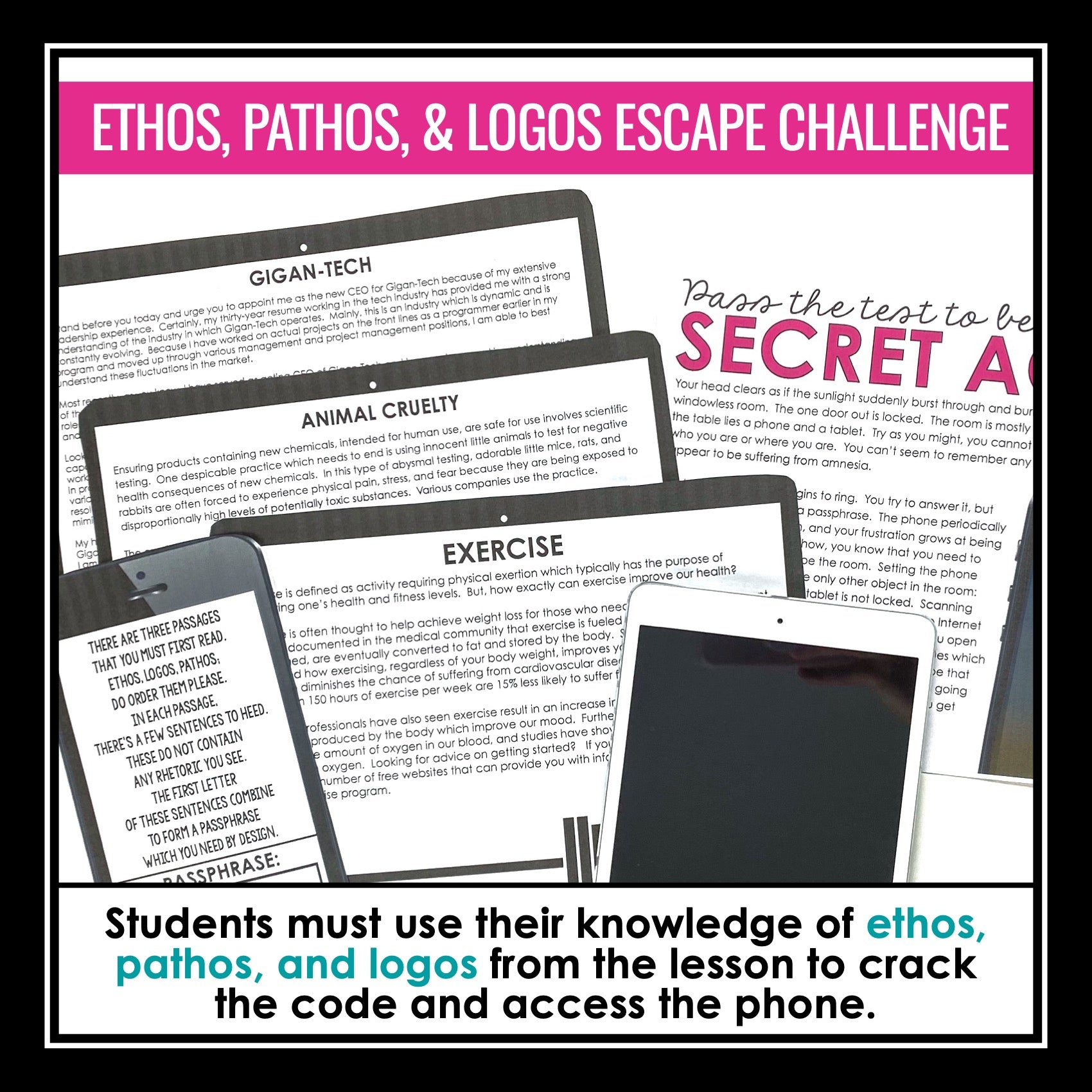 ➡️ Ethos, Pathos, and Logos Escape Room Style Challenge: In this interactive escape-room style rhetorical appeals challenge, students must read an original short story and read three passages and find examples of ethos, pathos, and logos to reveal a hidden passphrase to become a secret agent!