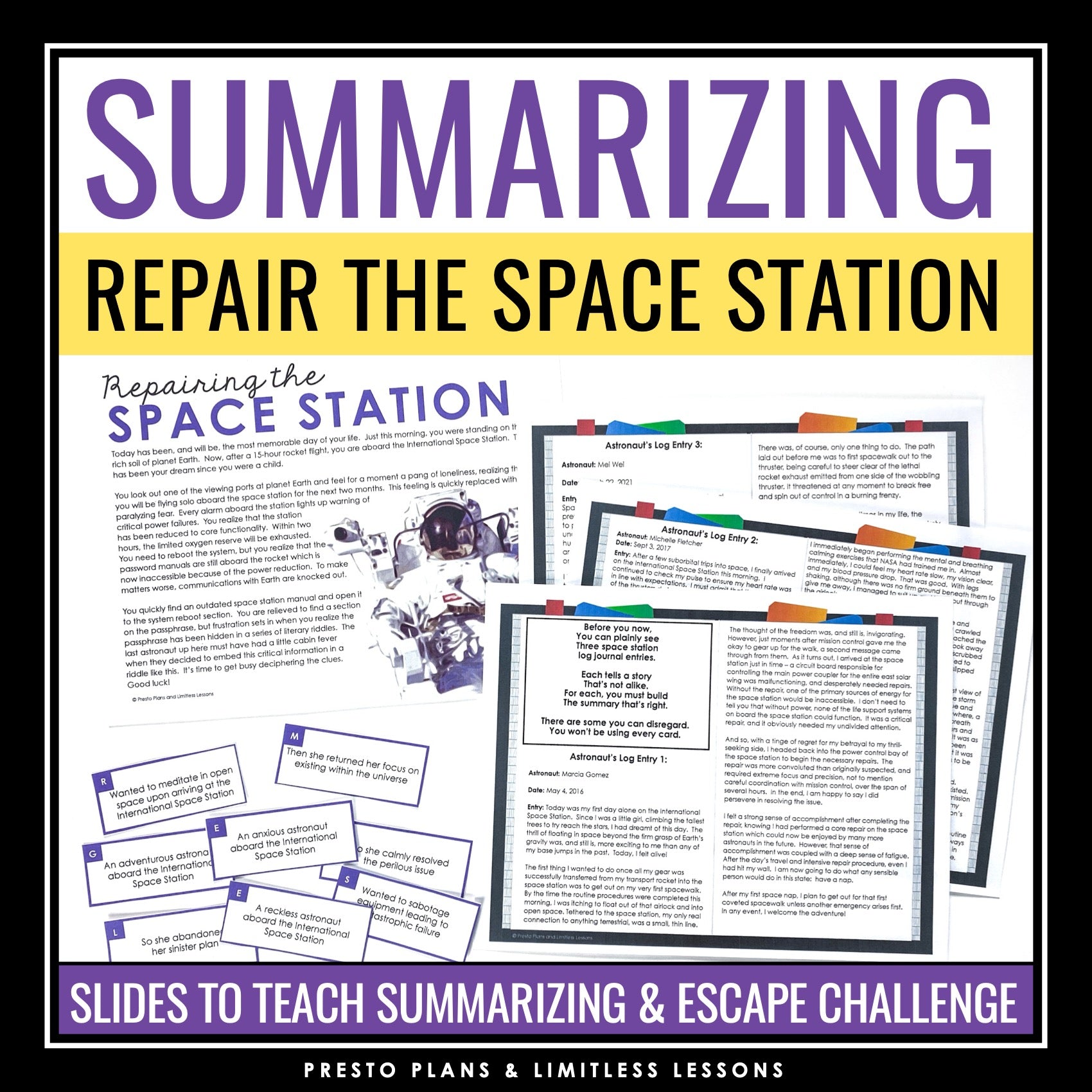 Summarizing a Text Presentation & Escape Room Reading Challenge Activity: This summarizing reading escape room style challenge is a new and fun way to engage your students and improve their understanding of how to summarize information! The detailed presentation introduces summarizing with clear examples, ensuring student understanding from the start. The highlight of the resource is the engaging escape room-style challenge, where students read an original narrative back story where they must repair a space station. Then, they must collaborate in groups to crack a summarizing-related challenge to unlock the solution and find the passphrase to reboot the system!