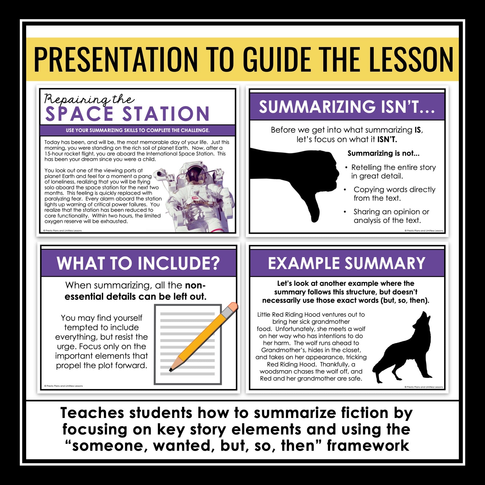 ➡️ Summarizing Presentation Slides: Use these PowerPoint presentation slides to guide the summarizing lesson and activity with instructional slides, activity prompts, the narrative story text, story conclusion slides, and answer keys for review.