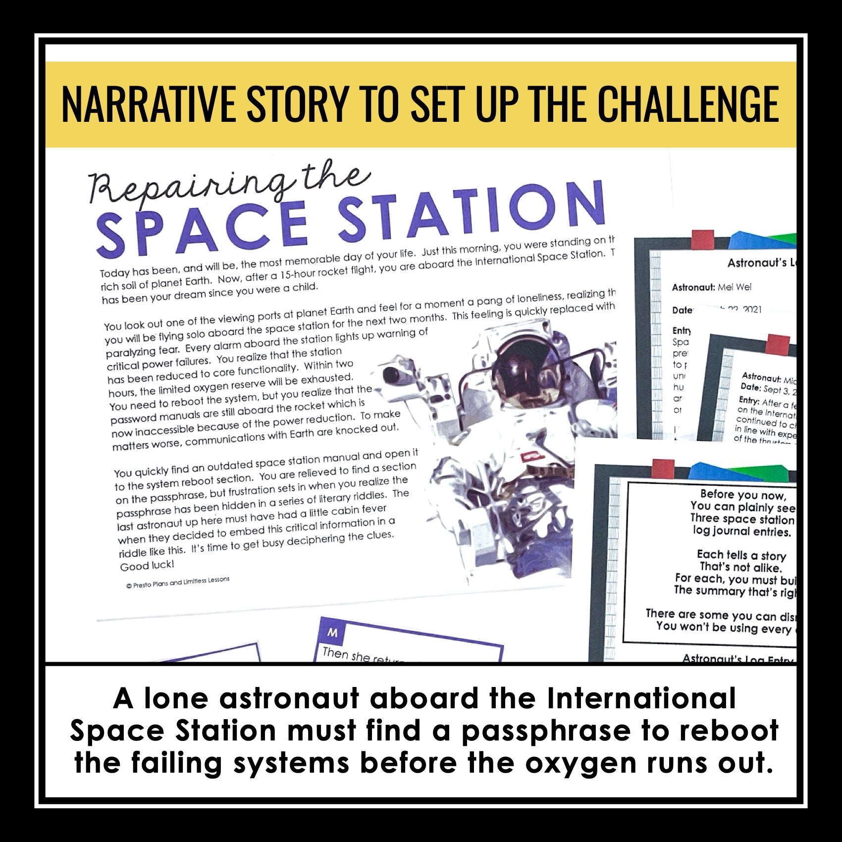 ➡️ Repairing the Space Station Narrative Back Story: Next, students are ready to put what they have learned into action! They will begin the challenge by reading a short backstory that sets up the escape room challenge. You and your classmates find yourselves on the International Space Station, exhilarated by the realization of a lifelong dream. However, excitement turns to trepidation as alarms blare, signaling critical power failures. With limited oxygen and no access to crucial manuals or communication with Earth, you and your fellow students must work together to decipher literary riddles and reboot the system before it's too late.