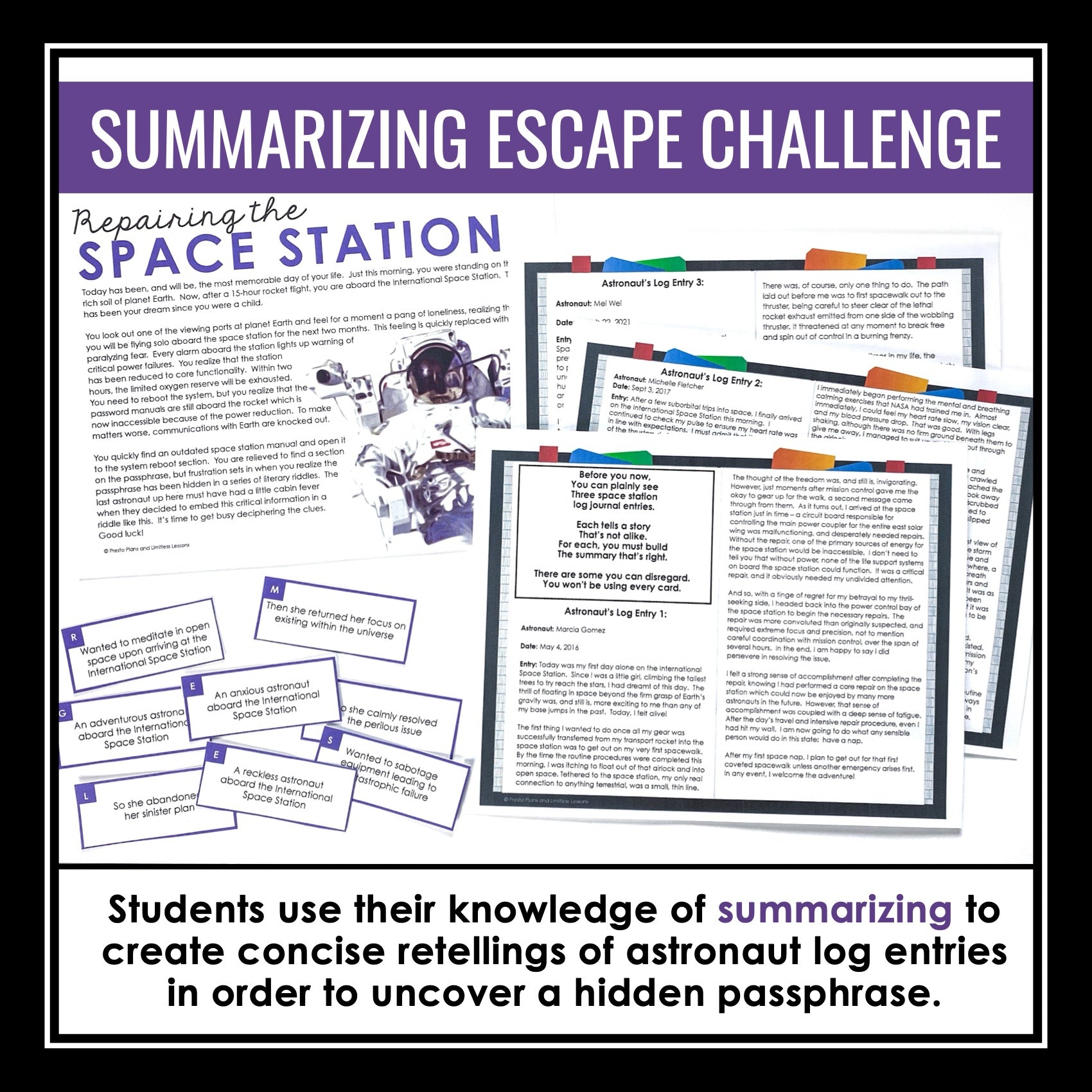 ➡️ Summarizing Escape Room Style Challenge: In this interactive escape-room style summarizing challenge, students must read an original short story and five astronaut logs. They will formulate a summary of each log by combining 5 of the summary cards using the someone, wanted, but, so, then strategy to reveal a hidden passphrase to fix the space station.