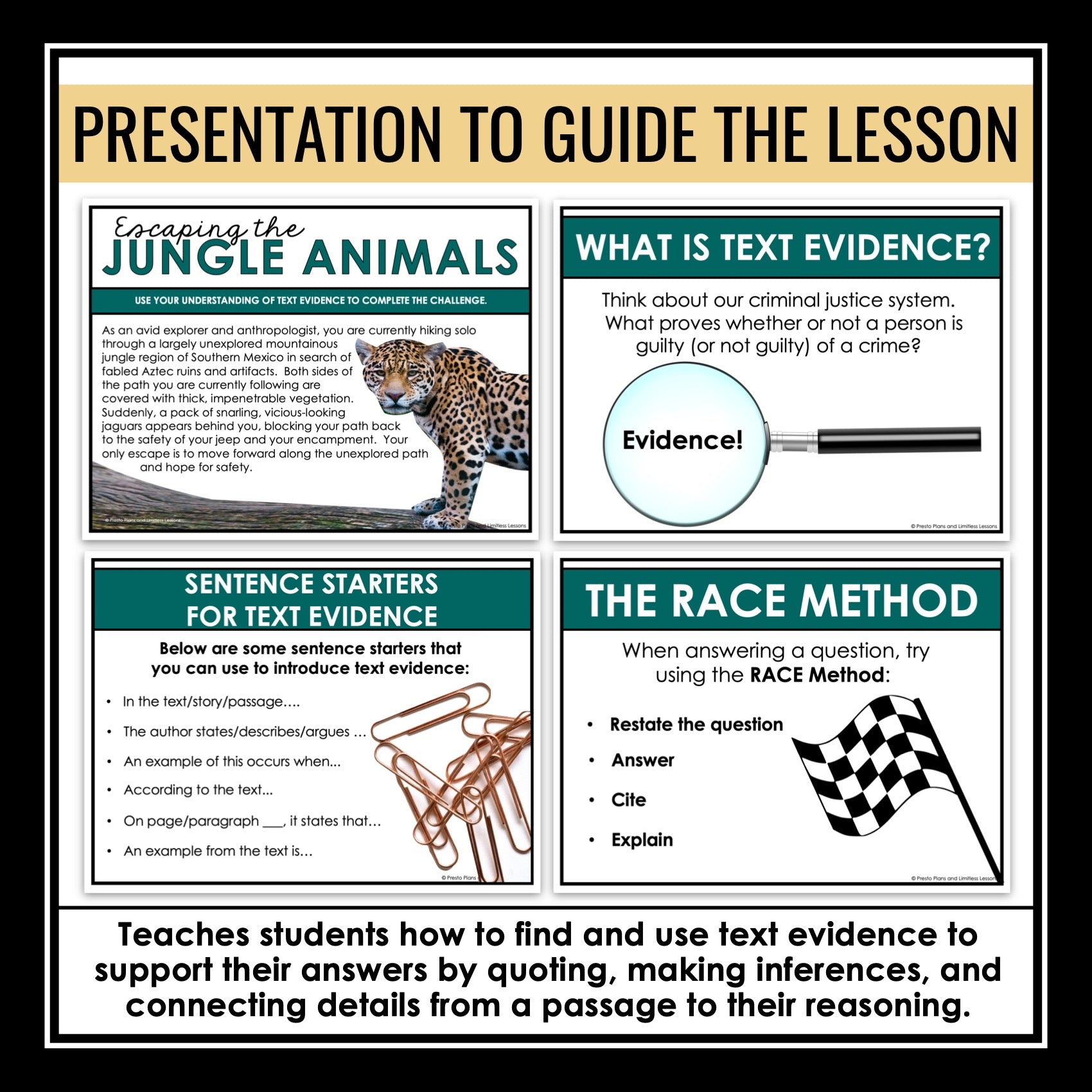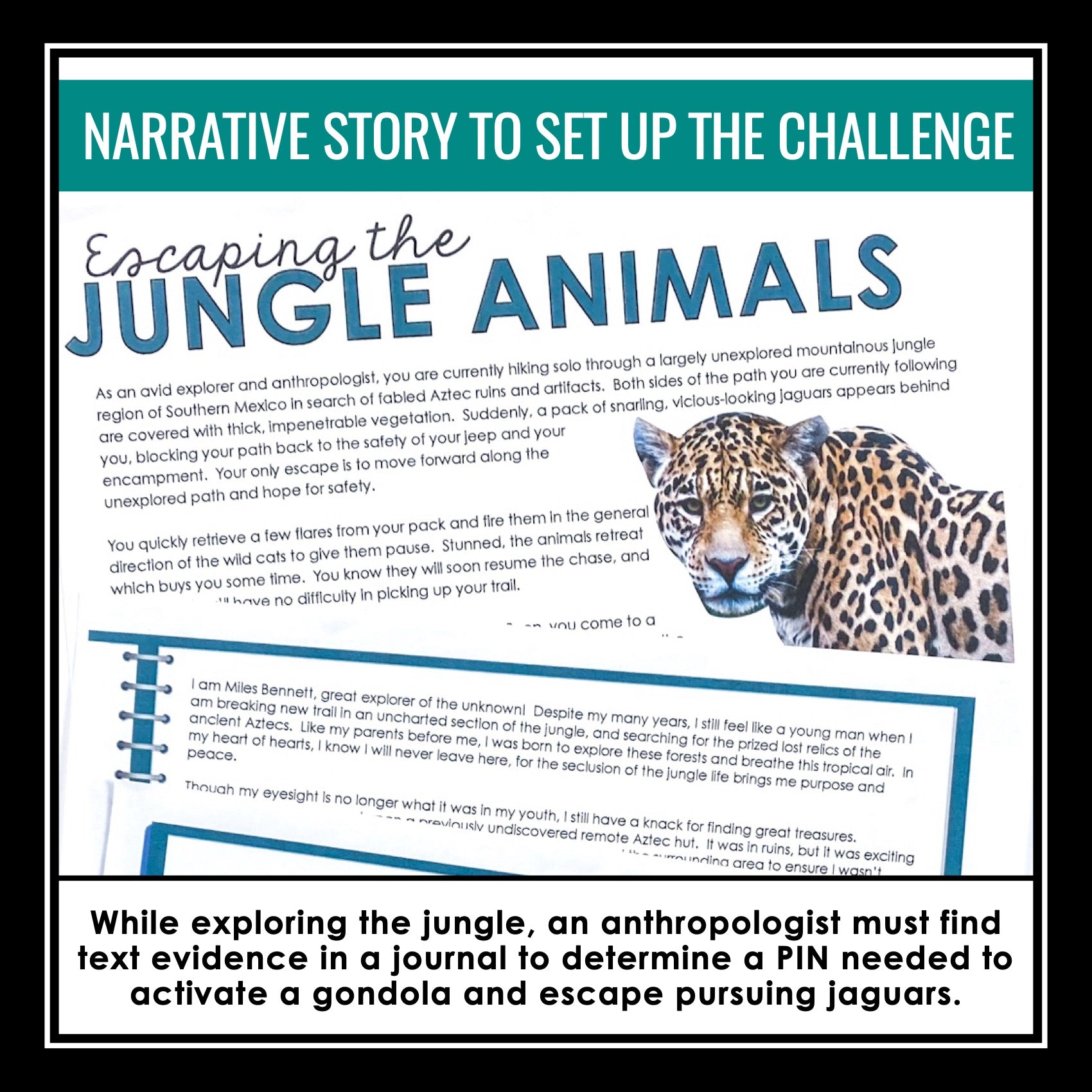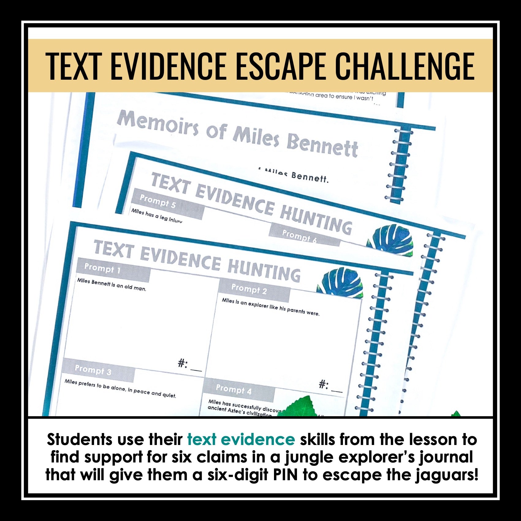 Text Evidence Presentation & Citing Evidence Escape Room Close Reading Activity: This text evidence reading escape room style challenge is a new and fun way to engage your students and improve their understanding of finding text evidence to support claims! The detailed presentation introduces how to find text evidence with clear examples, ensuring student understanding from the start. The highlight of the resource is the engaging escape room-style challenge, where students read an original narrative back story where they must escape the jungle animals. Then, they must collaborate in groups to crack a text evidence-related challenge to unlock the solution and find the pin to escape the pursuing jaguars!