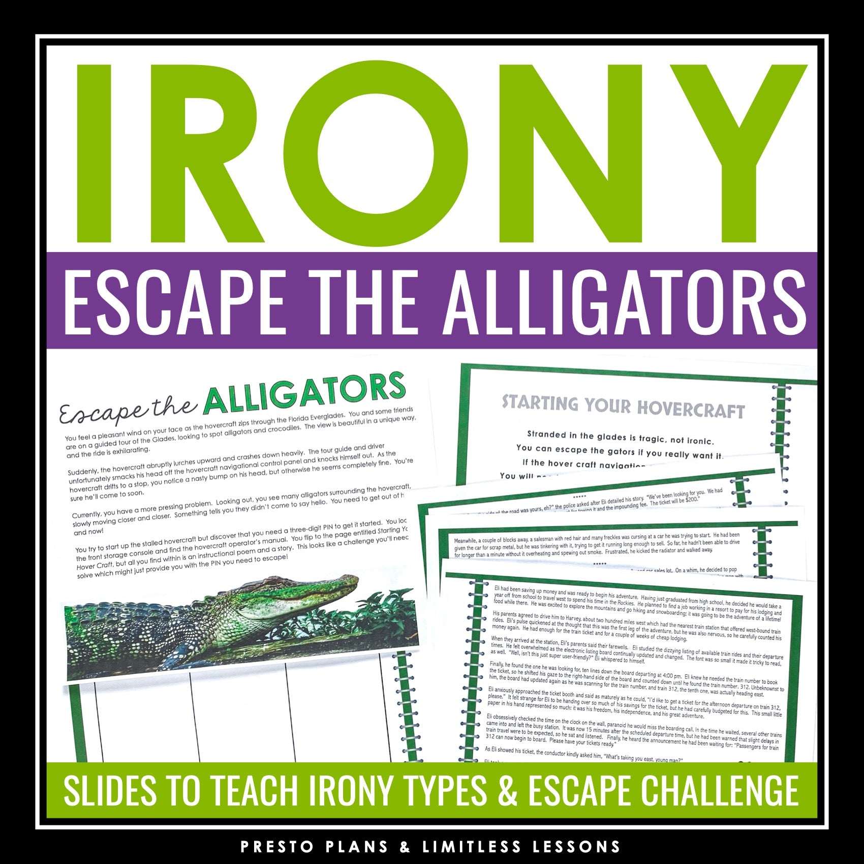 ➡️ Irony Escape Room Style Challenge: In this interactive escape-room style irony challenge, students must read an original short story and count the number of instances of verbal, situational, and dramatic irony in a story to reveal a hidden PIN to escape the alligators!