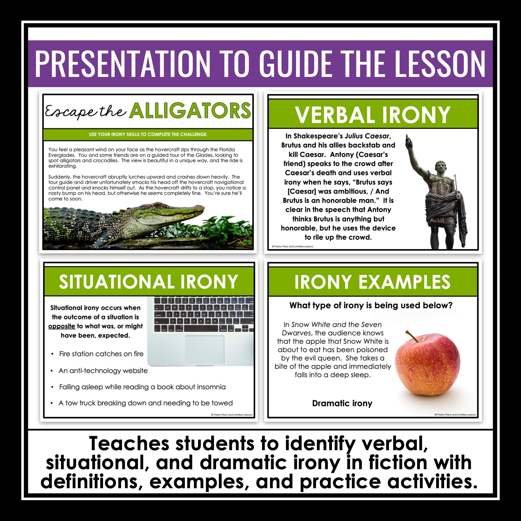 - Use the PowerPoint presentation to guide you through each element of the irony lesson and activity. The slides will help you teach about verbal, dramatic, and situational irony. It will also introduce the story and challenge, and review the answers.
