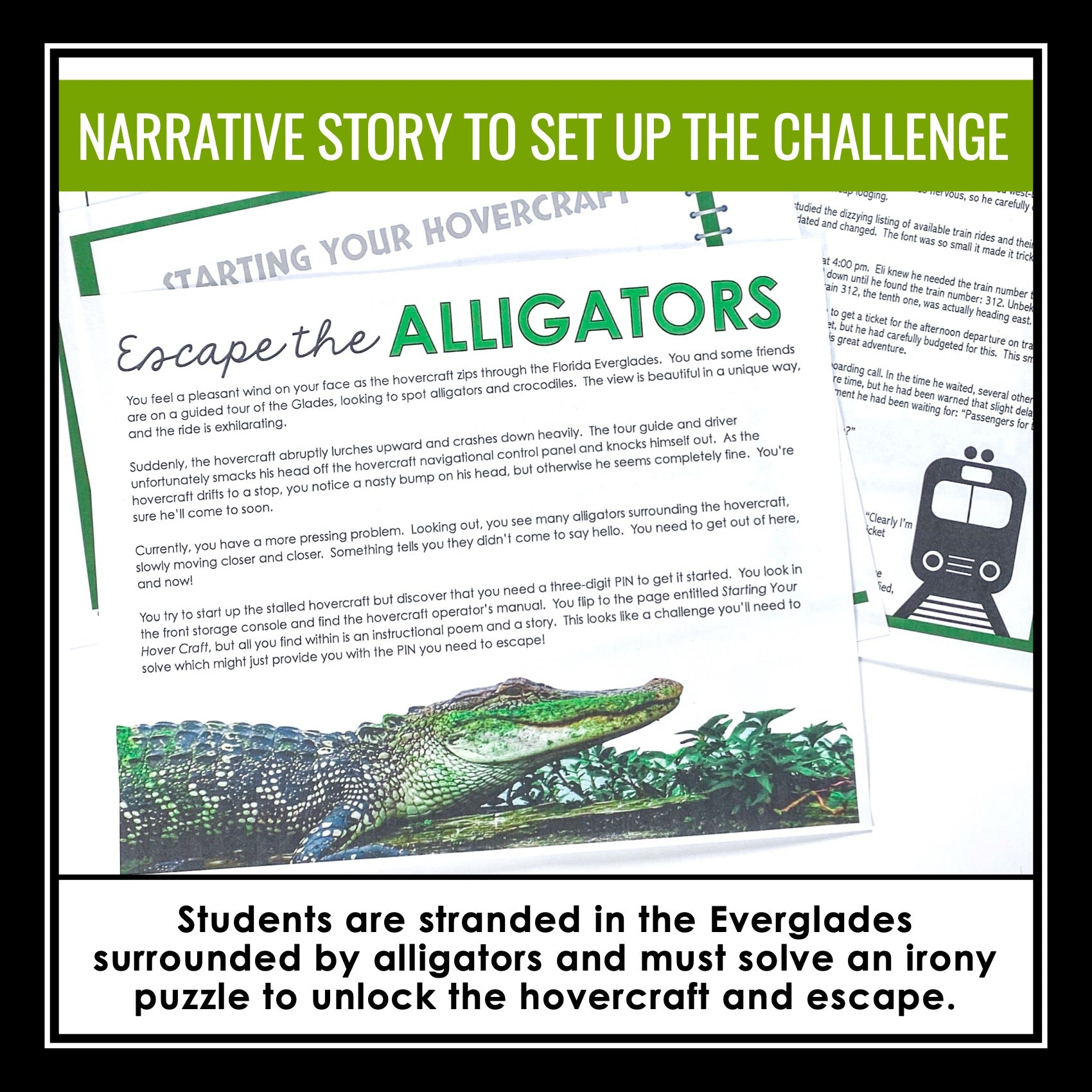 Irony Presentation & Verbal, Dramatic, Situational Escape Room Reading Activity: This irony reading escape room style challenge is a new and fun way to engage your students and improve their understanding of irony! The detailed presentation shares information on verbal irony, dramatic irony, and situational irony with examples for each one. The highlight of the resource is the engaging escape room-style challenge, where students read an original narrative back story where they must escape an alligator attack. Then, they must collaborate in groups to crack an irony-related challenge to unlock the solution and find the code to restart the hovercraft and escape the alligators.