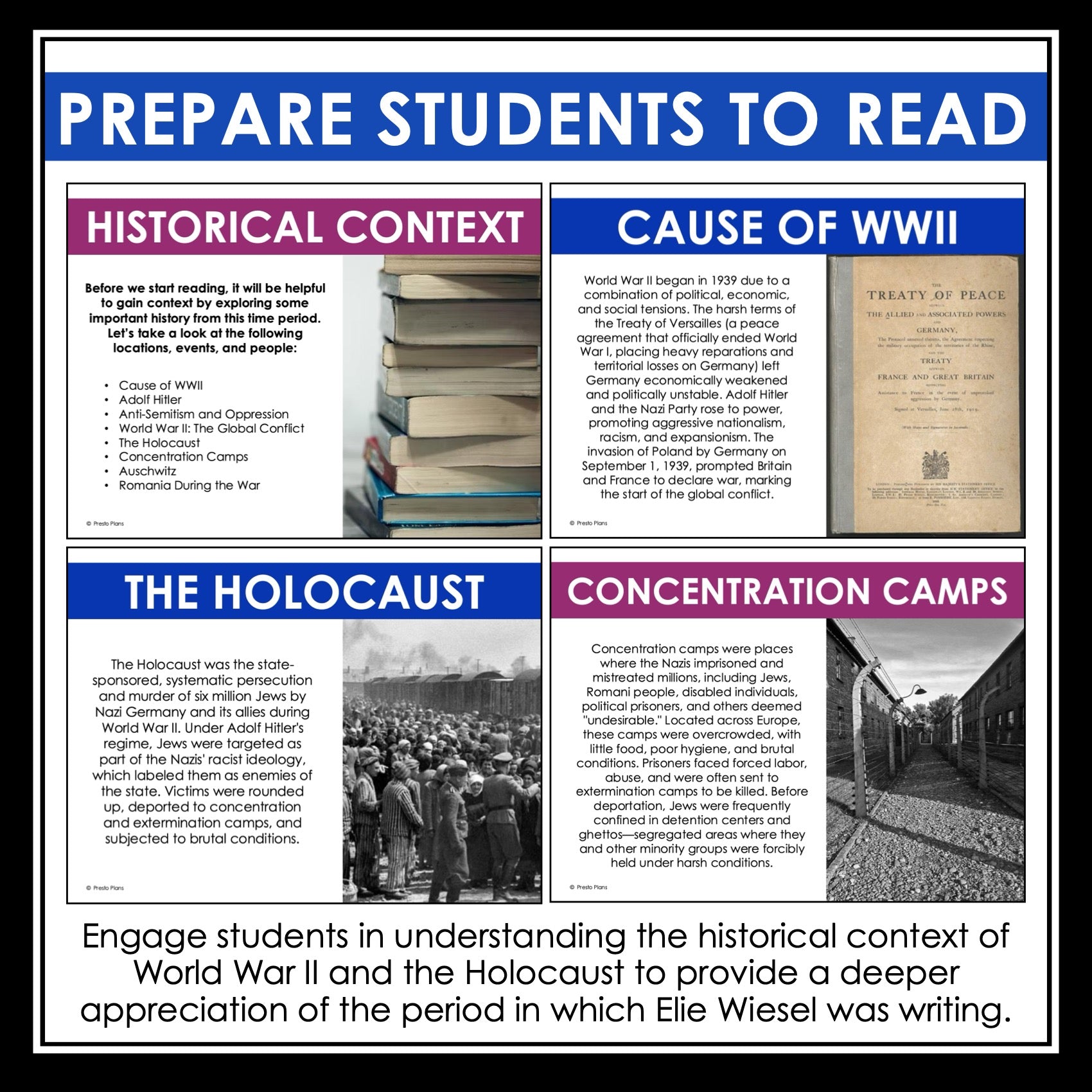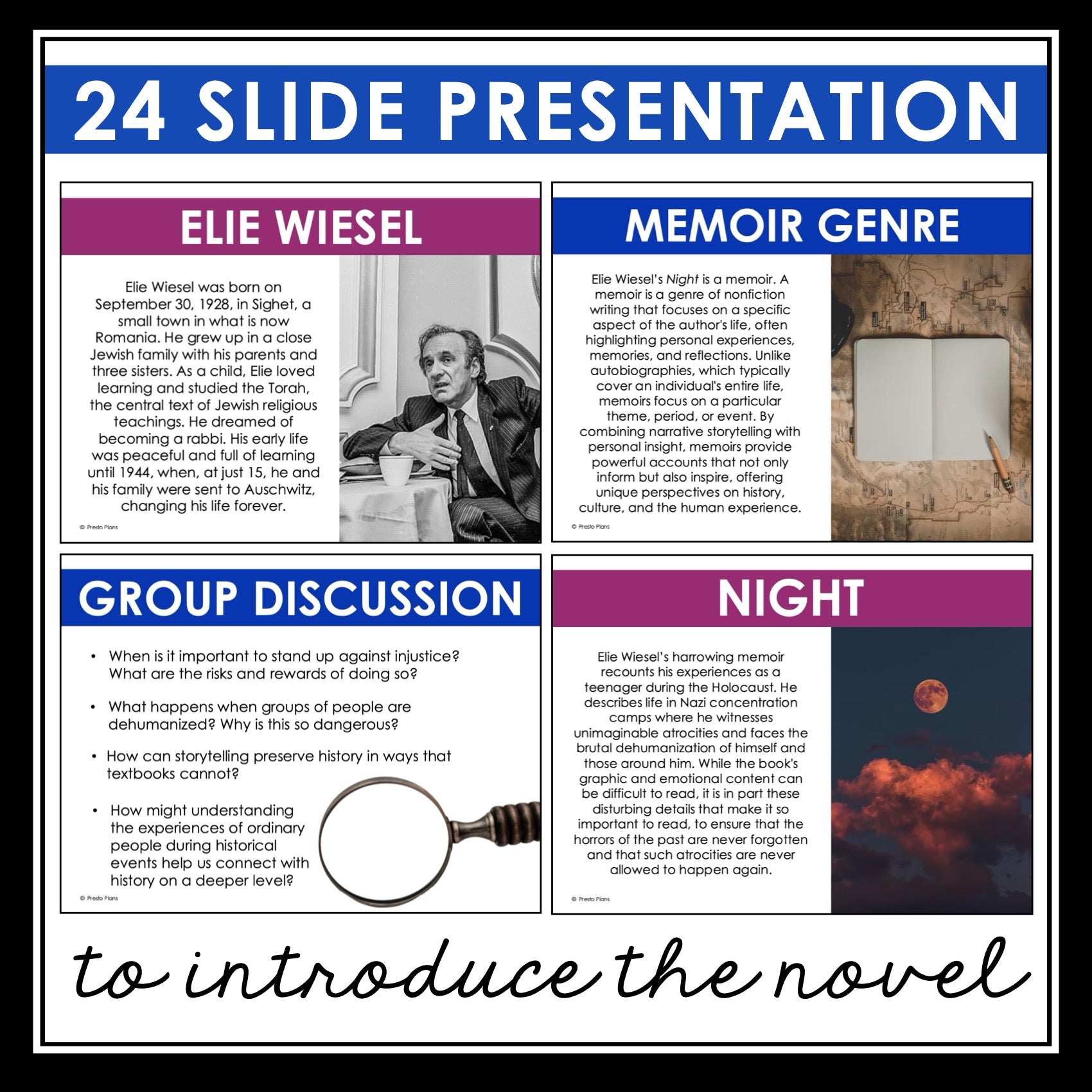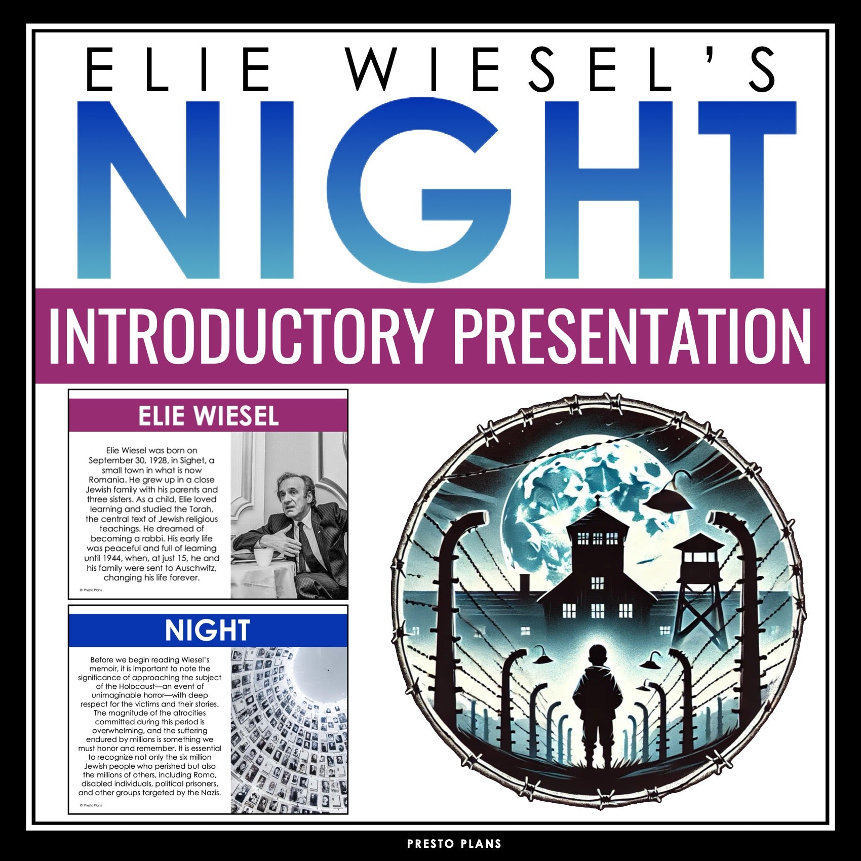➡️ This 23-slide PowerPoint presentation is the perfect way to introduce Night to your students. The slides build crucial background knowledge while encouraging student engagement and reflection. Included in the presentation: