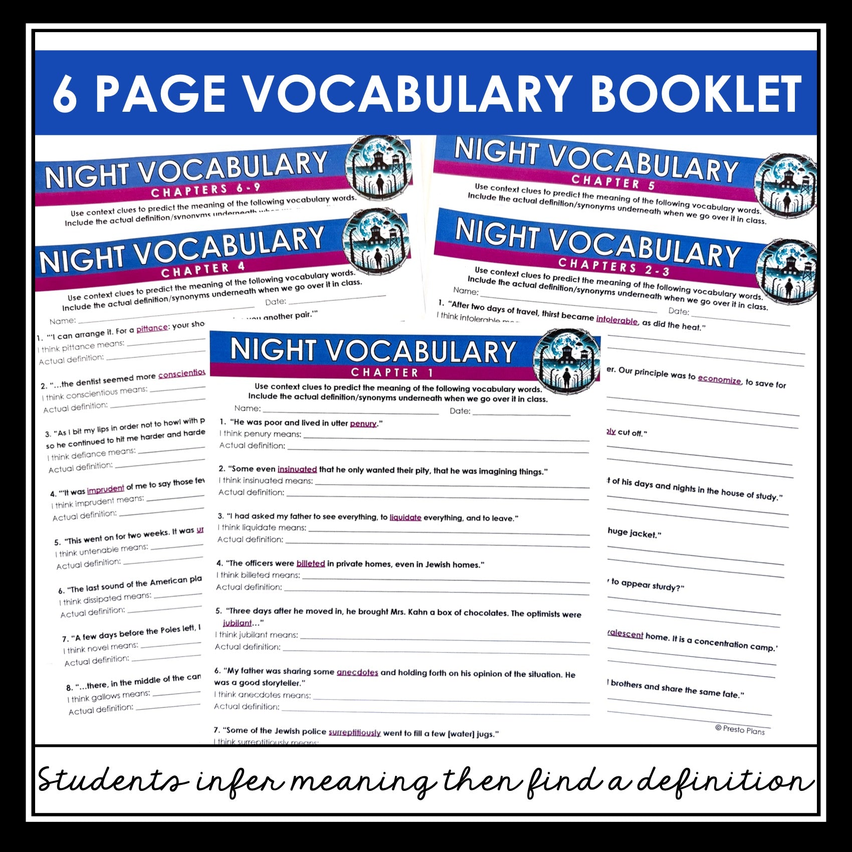 ➡️ Night Vocabulary Booklet: Each of the five booklet pages includes quotes from the novel that use a challenging word. Students must use context clues to determine the meaning of the bolded word. After students have made their guesses, they determine the definition of the vocabulary term and add it to the assignment.