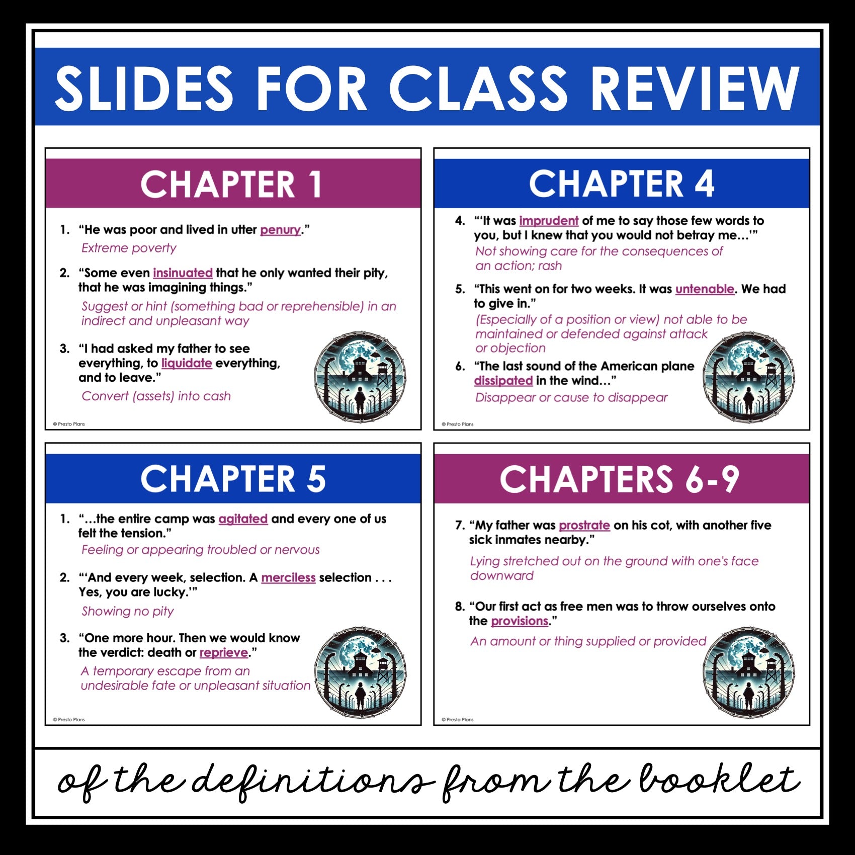 ➡️ Night Vocabulary Definitions Presentation: After students have completed the assignment, use this PowerPoint presentation to review the definitions of each of the vocabulary terms with students. Each slide includes quotes from the novel and easy-to-understand definitions.