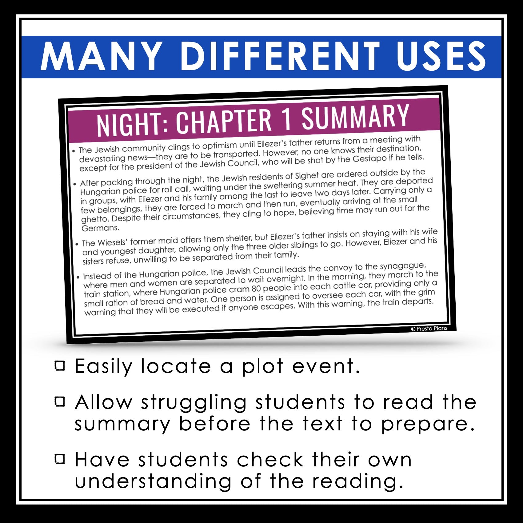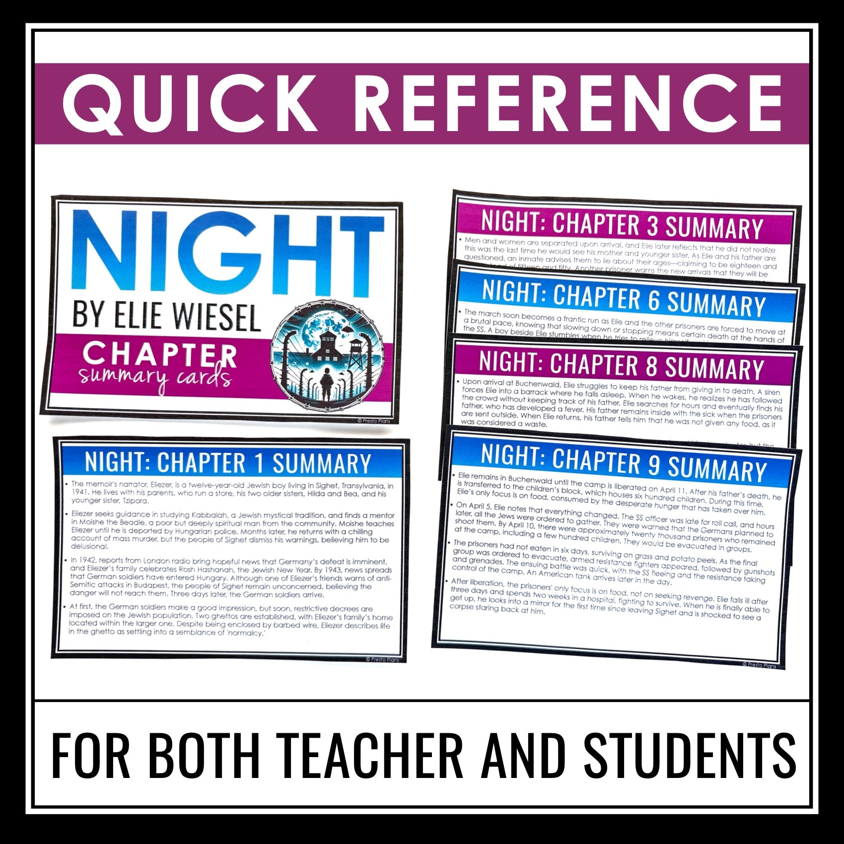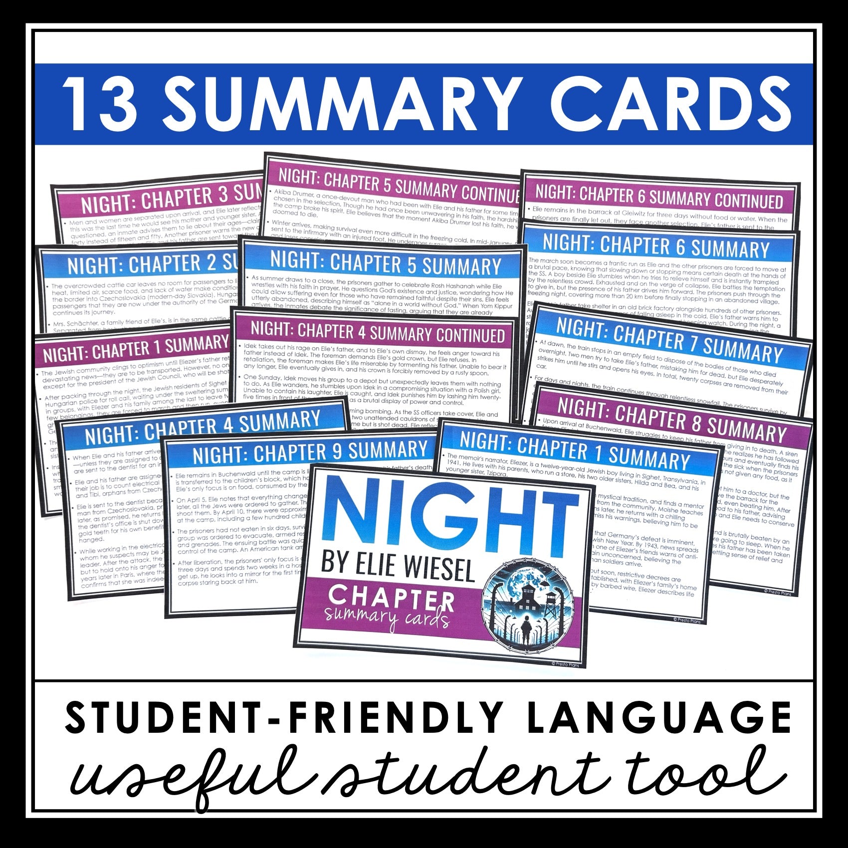 - Finding Text Evidence for an Essay: Students writing essays on Night can use these summary cards to locate the relevant sections for quotes or textual evidence.