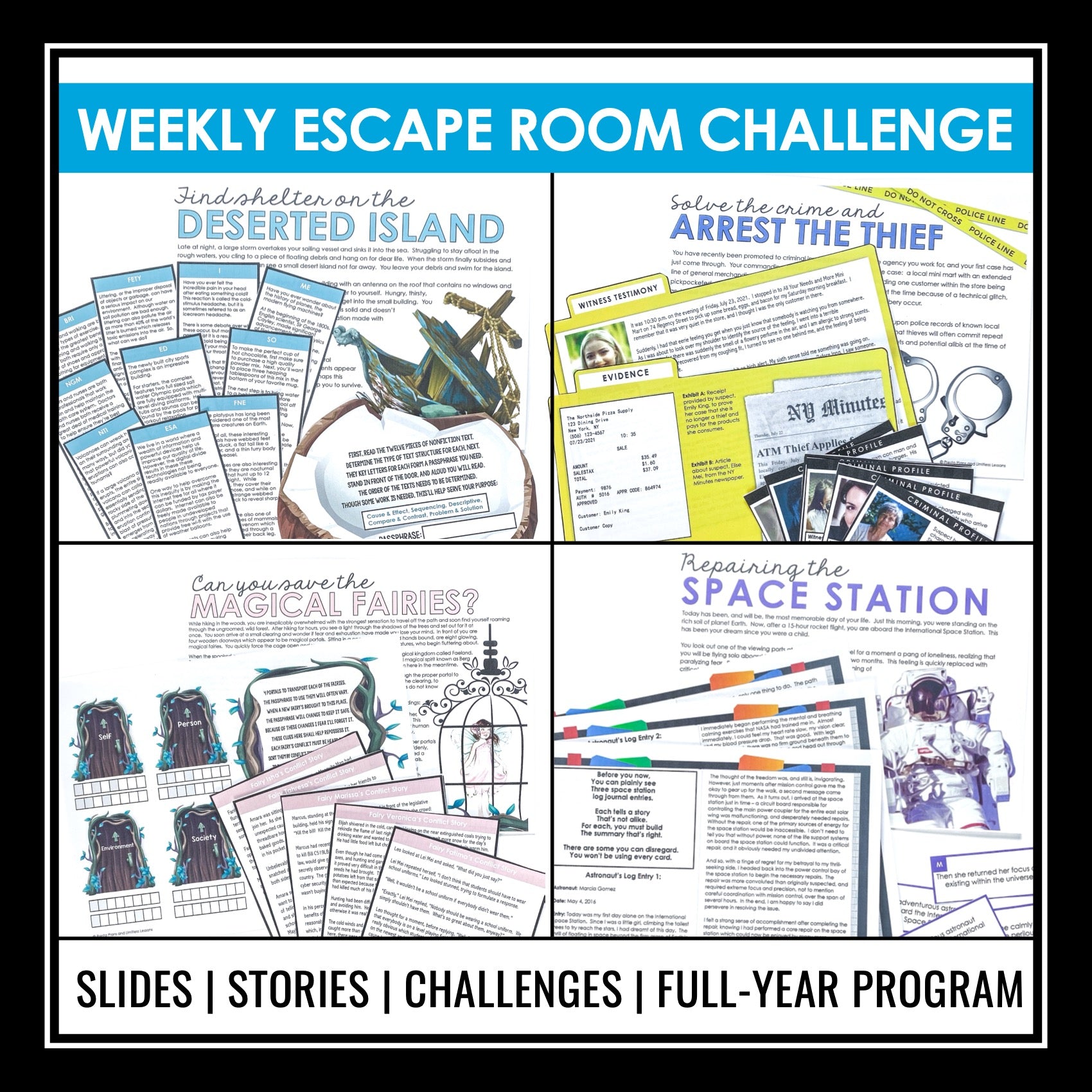 - Apply Reading Skills: Once the concept has been introduced and the story is read, students are ready to dive into the reading challenge! These escape-room-style activities are designed to reinforce comprehension and analysis as students work together to solve puzzles. They’ll apply their knowledge of the week’s reading concept, using critical thinking to progress through the challenge.