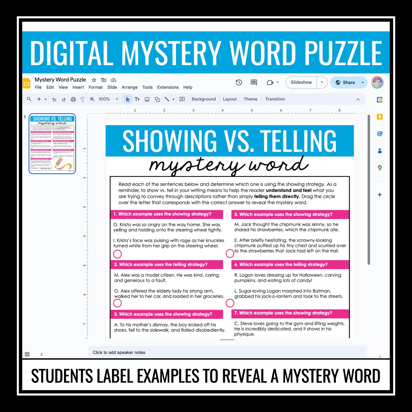 ➡️ Showing vs. Telling Digital Mystery Word Activity: Students will identify the difference between showing vs telling examples to reveal a mystery word. An answer key is provided.