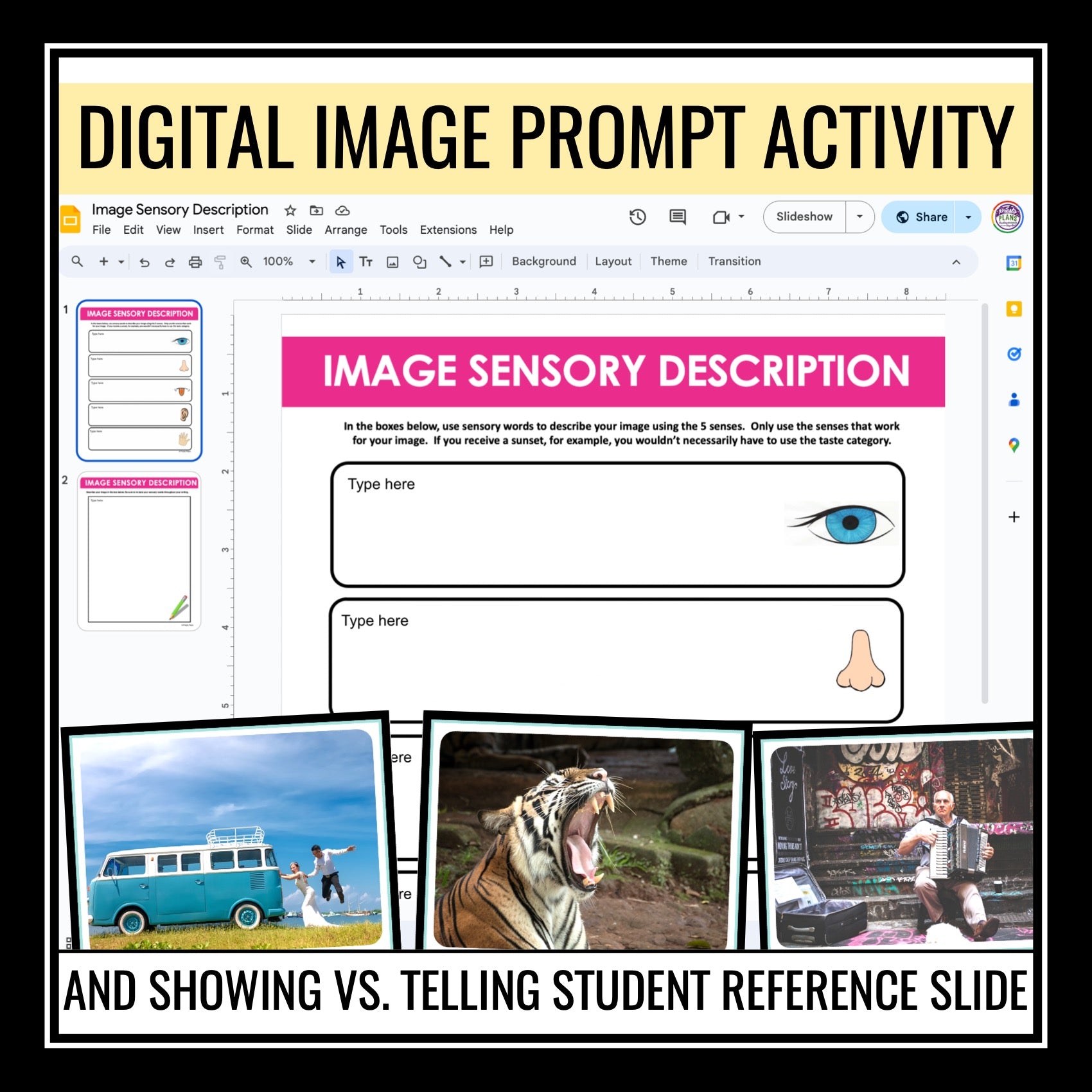 ➡️ 24 Visual Digital Cards: Use these digital cards to inspire writing and have students show off what they learned about the showing vs. telling writing strategy.
