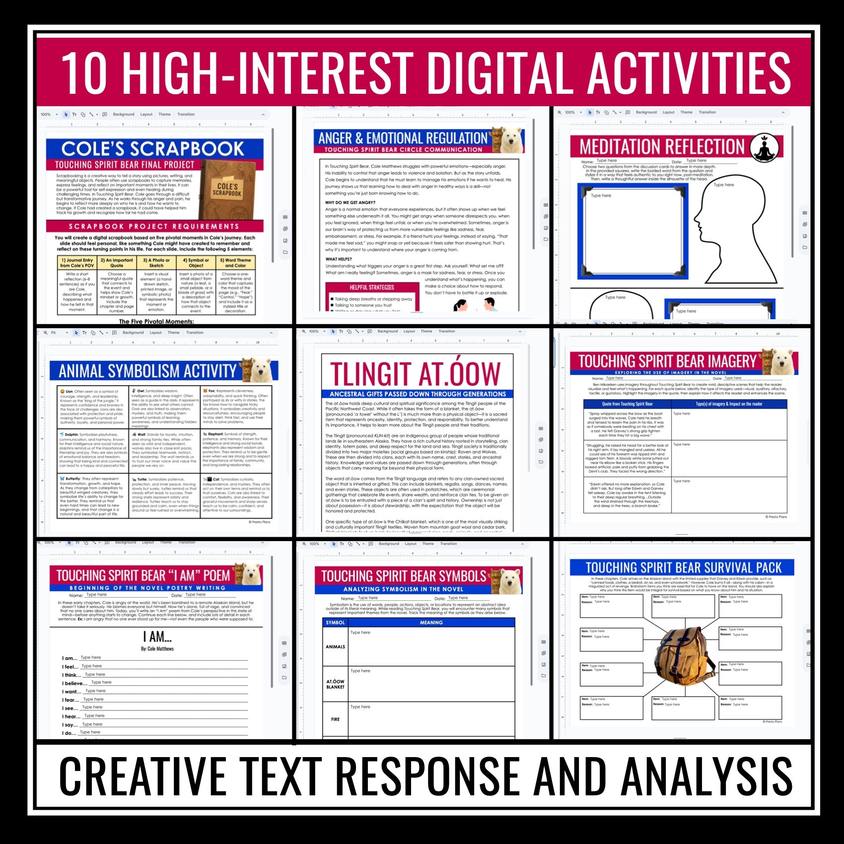 Touching Spirit Bear Unit Plan - Ben Mikaelsen Novel Study Reading - Digital: This comprehensive digital unit plan includes everything you need to teach Touching Spirit Bear with confidence and purpose. With over 350 digital slides of engaging content, this ready-to-use resource will help your students explore the powerful themes, rich symbolism, and emotional depth of Ben Mikaelsen’s novel. From comprehension checks and vocabulary development to figurative language practice and literary analysis, each component is fully digital and designed to create a meaningful learning experience while saving you hours of planning time.
