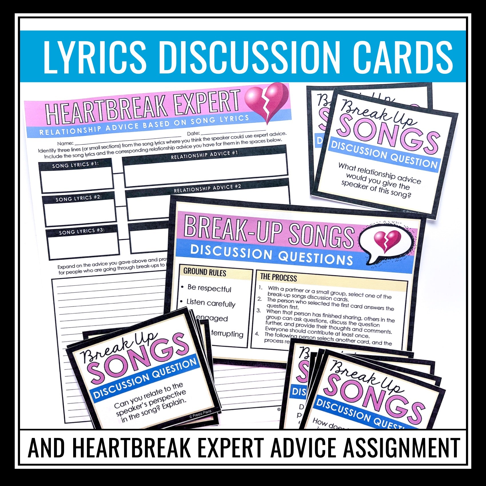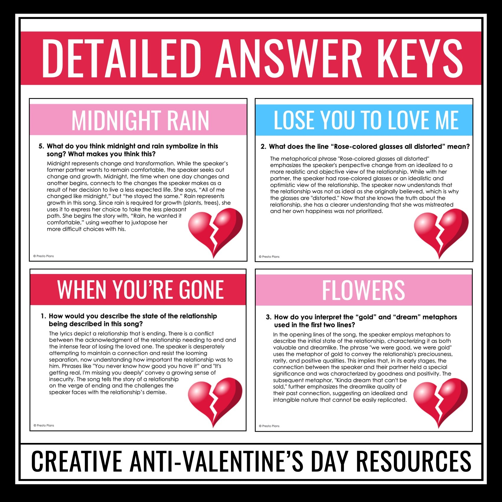 ➡️ 30 Break-Up Songs Digital Discussion Questions: After students have analyzed the songs, have them get into groups and use these 30 digital discussion questions that can work for any of the songs. Students will make text connections, examine the lyrics more closely, consider alternative viewpoints, and much more! Discussion ground rules and a process are provided for students to follow. This is a low-stress way for students to examine and discuss poetry around Valentine's Day.